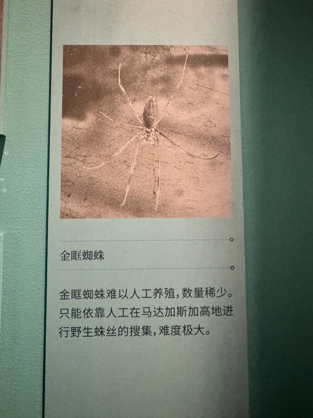 • 获取难度:由于蜘蛛具有同类相食的特性,难以大规模养殖,且一只蜘蛛一天仅能产出少量蛛丝,例如马达加斯加红腿金圆蛛,平均23000只蜘蛛才能产出约一盎司的丝,所以获取金蛛丝的难度极大,成本高昂。