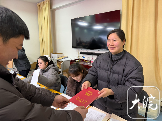 大皖新闻讯1月13日上午,52岁的张阿姨在家门口领到了自己和老公的不动产权证。张阿姨家住亳州市高新区文采家园小区,几年前,安置小区的建成让她和家人实现了“安居梦”,如今安置房“上门办证”服务又让她在家门口就完成了不动产权证办理。“我从家走过来就四五分钟,之前和我老公来交了材料走了流程,都不需要孩子陪着,不到一上午就搞好手续了,今天我过来直接领证,很方便。”张阿姨手里拿着崭新的“大红本”,笑着告诉记者。