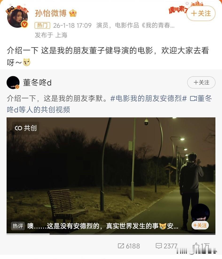 1月18日,孙怡宣传前夫董子健导演的新片《我的朋友安德烈》。这是两人自2022年离婚后首次公开互动。 孙怡:介绍一下 这是我的朋友董子健导演的电影,欢迎大家去看呀 董子健半小时后回复“谢谢你,我的朋友” 大家都觉得离婚是仇恨的开始,但其实只是这段爱情的结束,也可以是友情的开始。 也有网友说,因为这个电影叫我的朋友安德烈,孙怡说的是我的朋友董子健,所以董子健也回了我的朋友,是个梗! 我觉得孙怡其实挺厉害的,能在这个行业里面敢做敢当,然后比较自由,真的很难得了。不论他私下是什么样的人。起码在公众上面,我觉得挺厉害的。 大家觉得呢?