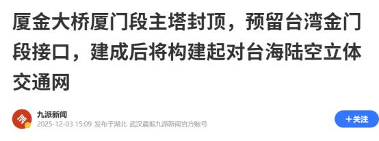 这是带领两岸一起赚钱的经济路!2025年12月1日,厦金大桥厦门段主塔封顶!金门县上下没一人反对,县长更是高度评价! 在我国经济得到发展的背景下,厦金大桥被提出。该概念一提出,立即在两岸引起了较大反响。 厦金大桥的建设可以增加厦门和金门两个城市之间的交流,也能够扩大两岸的政治互动。所以对于两岸来说,这是一个非常好的项目。但是因一些客观因素的影响,台湾岛内不少人对此提出了反对的看法。 而在这种背景下,作为金门县县长的陈福海则全力支持,并公开表示金门县全县上下没有一个人反对。而在两岸的大力支持下,该项目顺利推行。就在2025年12月1日的时候,厦金大桥厦门段的主塔终于封顶。 这则消息令两岸为之激动,在国际局势复杂的当下。去搭建起一座让两岸沟通的桥梁,显得尤其重要。作为金门县县长的陈福海,对于两岸关系有着锐利的看法。他的大力支持,对厦金大桥来说更是极其重要的付出。 而他除了支持厦金大桥建设之外,针对两岸关系,他还曾表示厦门和金门是兄弟,要做到互补。 这一点令人为之动容,台湾岛内有一大部分的台独分子。他的这番发言势必会给他的政治等其他方面造成影响,但他却丝毫没有畏惧,而是坚定的去促进两岸沟通。 如果能够多一些这样的官员,相信两岸问题很快就能得到解决!两岸本是同根生,身上都共同流淌着中华民族的血脉。 对此,您怎么看? (信息来源:厦金大桥厦门段主塔封顶,预留台湾金门段接口,建成后将构建起对台海陆空立体交通网-九派新闻) (信息来源:专访金门县长陈福海: 金门厦门是兄弟,要互补-厦门日报)