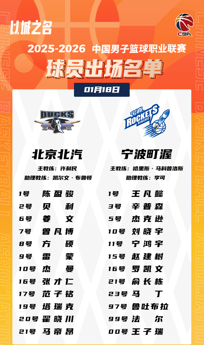 虎扑01月18日讯今日CBA常规赛,北京对阵宁波的大名单已经公布。