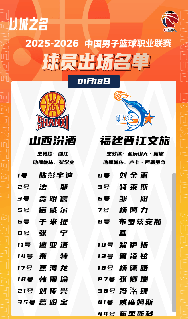 虎扑01月18日讯今晚CBA常规赛,山西对阵福建的大名单已经公布。