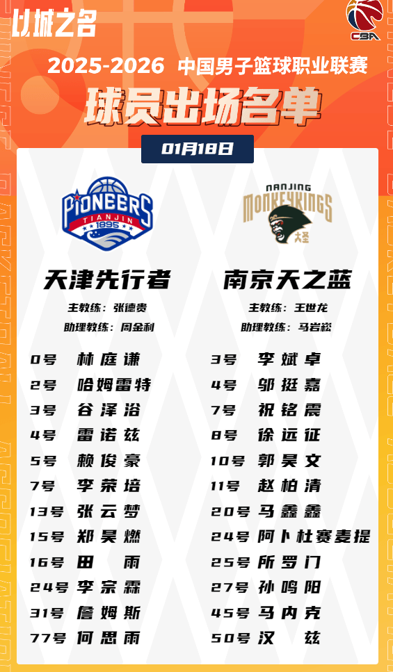 虎扑01月18日讯今晚CBA常规赛,天津对阵南京的大名单已经公布。