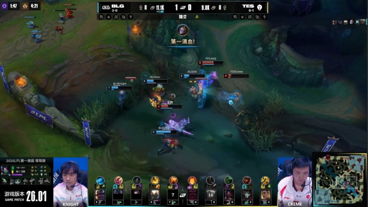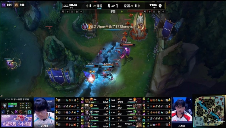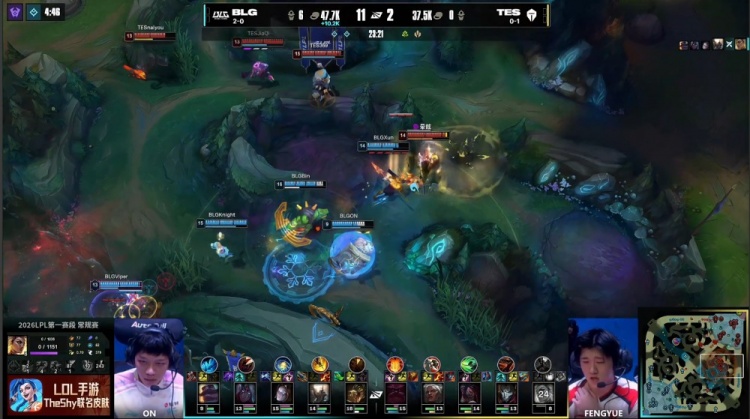 [19:35]BLG下路放出先锋推掉TES二塔,随后BLG转中推掉TES二塔,BLG经济领先9k。