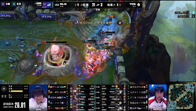[10:29]上路阿Bin鳄鱼开大强行融化开大清兵后的369奥恩,Bin狂吃塔皮,同时下路小龙团Viper韦鲁斯隔墙开大击中fengyue将其秒掉,正面Viper再杀naiyou安蓓萨,BLG打出0换3。