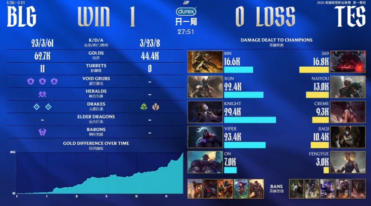 中期369再次被越,BLG拿到先锋推掉TES下路二塔,18分钟经济领先8k,比赛早早进入垃圾时间。