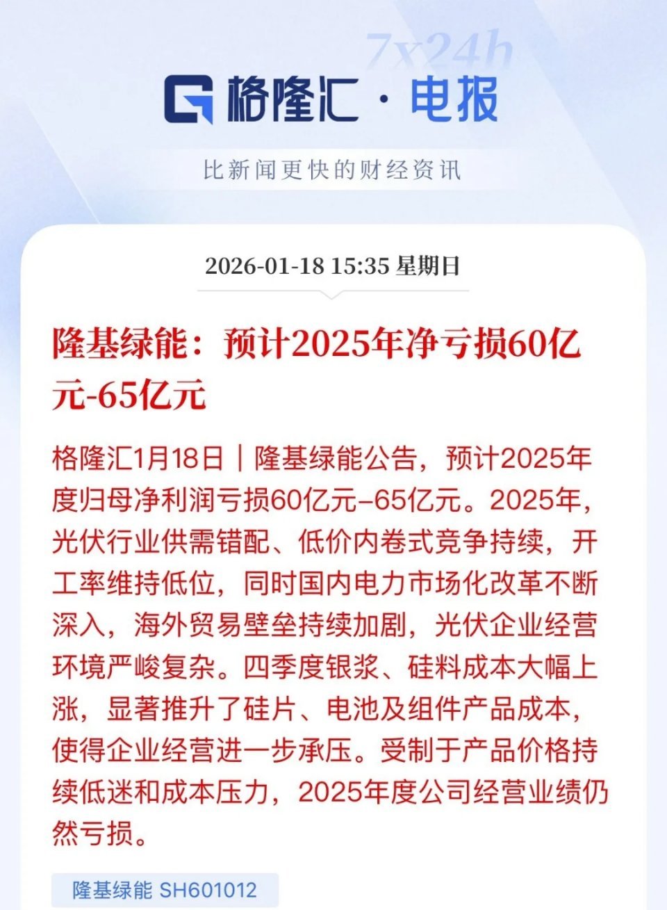 光伏遭遇利空了,业绩暴雷了,通威、隆基双双净利润暴亏,内卷和成本压力的双重压力下,隆基从2024年亏损的86亿元到2025年的预期亏损60-65亿,这算是亏损收窄了,隆基亏了60多亿,起码是亏损收窄了,通威更狠,在去年首年亏损70亿之后,今年更是直接预期亏损90-100亿,原材料价格上涨,带动成本上升,利润收窄,今年的白银暴涨,其他核心材料也是持续上涨,行业依然还是没到底啊。