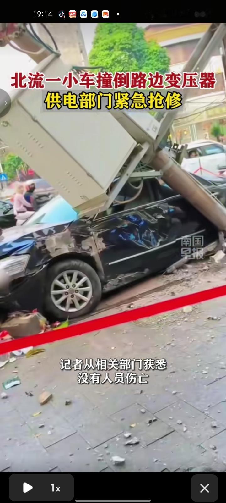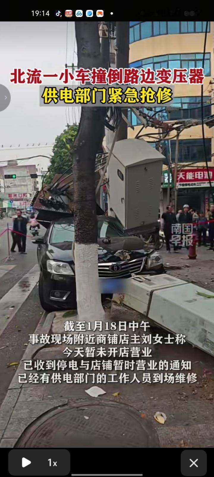 1月18日,玉林北流市城南一路与永安路交汇处发生一起交通事故,一辆黑色小车撞倒路边的电线杆及变压器,坠落至小车的后车窗,车辆变形严重,所幸无人伤亡。 附近商铺店主刘女士称,今天暂未开店营业,已收到停电与店铺暂停营业的通知,已经有供电部门的工作人员到场维修,