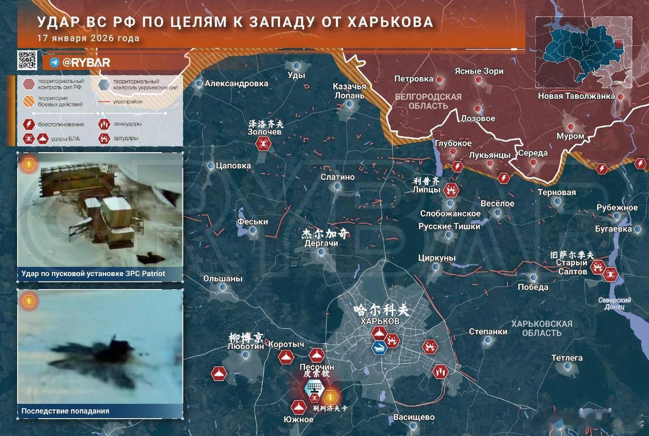 2026年1月17日,在乌克兰哈尔科夫西南约50公里的别列佐夫卡附近,俄军“卢比孔”无人机作战中心的无人机摧毁了乌军的一套“爱国者”防空导弹系统,包括一部发射装置和一部AN/MPQ-53雷达站。俄军“卢比孔”无人机作战中心用的是带星链的自杀式无人机摧毁了乌军的“爱国者”防空导弹系统。乌军的“爱国者”防空导弹系统通常部署在距离战线100公里以外,但这个位置距离双方接触战线43公里左右,但是在哈尔科夫大城市的身后。但也有西方媒体称俄军摧毁的只是诱饵,因为从俄方发布的无人机图像看,乌军“爱国者”防空导弹系统周围没有看到需要和MPQ-53雷达一起行动的MSQ-104控制站和EPP发电车。