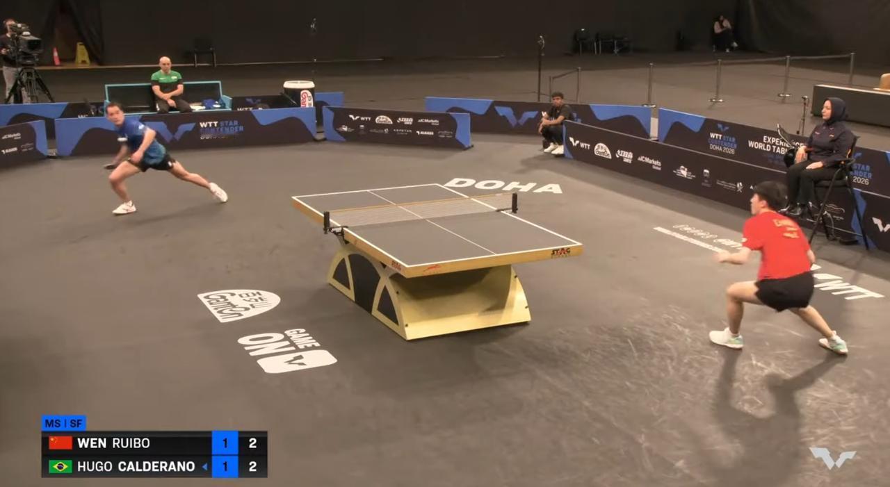 过瘾呀!过瘾! 前两局温瑞博和雨果打成1:1 第三局雨果2:0开局 温瑞博连下3球, 第三球打的太漂亮了。 温瑞博挑起来呼雨果。 这对攻的角度太大了, 两人都跑出屏幕了, 看的热血沸腾呀。 关键是一局里面有一半是这样的球, 太劲爆了。