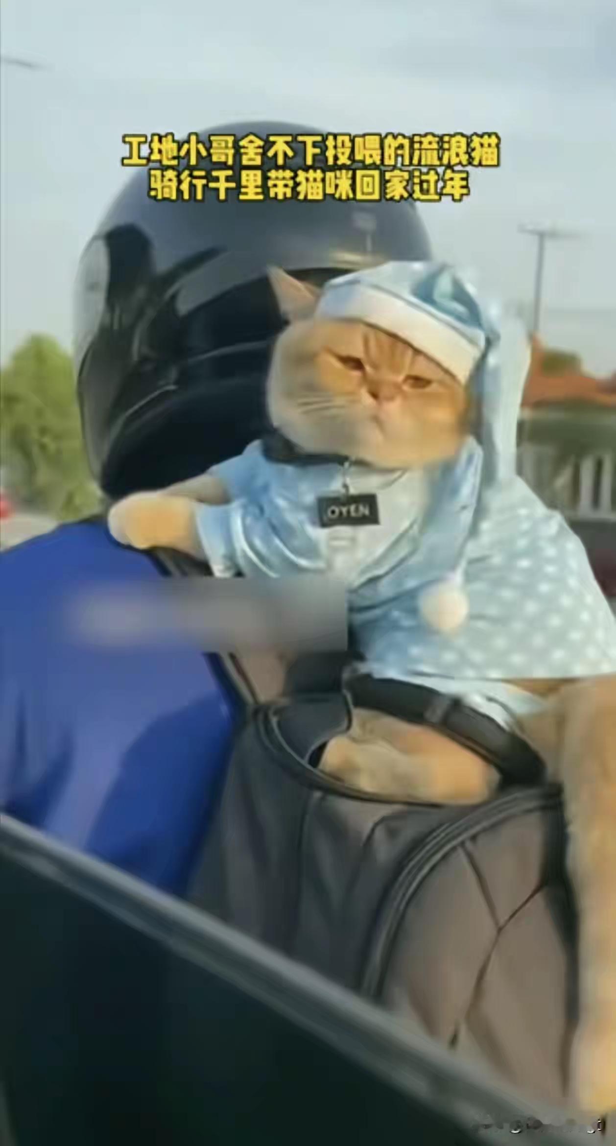太暖心了!一男子回家过年时,由于放心不下在工地上喂养的流浪猫,担心它会出现什么意外,于是就骑行1000多里带它一起回家过年。 黎明破晓前的国道上,寒风凛冽,一位身披厚重军大衣的男子正驾驶着电动车艰难前行。在他的后座上,并非什么贵重年货,而是一个加固的铁笼,一只通体漆黑的猫咪正透过笼条,好奇地窥探着昏暗的世界。 这一幕被路过的货车司机偶然记录并上传至网络,瞬间引发了舆论海啸,为了一只不起眼的流浪猫,这位异乡打工人竟选择骑行一千多里带它返乡过年。 时光回溯到半年前,在江苏苏州某处嘈杂的建筑工地上,一只瘦骨嶙峋、肋骨清晰可见的流浪猫蜷缩在废料堆旁瑟瑟发抖。李建国初次与它相遇时,小家伙警觉地弓起身躯,眼神中满溢着对人类本能的恐惧。 面对这个惊弓之鸟,他没有强行靠近,而是蹲下身,小心翼翼地从饭盒里拨出几块肉放置在地面,随后默默转身离去,给它留足安全距离。 这种无声的投喂持续了整整两个月,猫咪才卸下心防,敢于进入他身侧三米范围。又过了一个月,它终于鼓起勇气吃下他掌心的食物。 当那冰凉湿润的鼻尖触碰到粗糙手掌的一刹那,这位平日里沉默寡言的七尺汉子,眼眶不禁湿润了。在这座由钢筋水泥构筑的冰冷森林中,一人一猫竟成了彼此灵魂深处唯一的慰藉,每天下班后,他最渴望的时刻,便是听到那声熟悉的“喵”。 距离春节仅剩十天,工友们纷纷踏上归途。李建国在收拾行囊时,猫咪似乎预感到了什么,紧紧贴着他的脚踝,不停地磨蹭裤脚。 将它留下?工地即将断水断电,流浪猫根本熬不过这个凛冬。托运?客运规定严苛,且一千多里的颠簸极易导致猫咪应激猝死。 那一夜,他盯着这只小生灵彻夜未眠,最终咬牙做出了一个近乎疯狂的决定:骑电动车带它回家,哪怕要为此在寒风中多受两天两夜的罪。 启程之日,气温骤降,路面泛着寒光。李建国特意花了80元购置了一个加固型宠物笼,并用三层厚实的保温布将其包裹得密不透风,而他自己却仅在单薄的衣物外多套了件旧棉袄。 “它怕冷,我扛得住”,他一边将猫粮、羊奶粉和宠物应激药塞进编织袋,一边仔细检查着电动车的状况,就连备用的电池都是提前借好的。 前半程尚算顺遂,猫咪乖巧地趴在笼内,偶尔发出几声轻柔的呼唤。然而午后天公不作美,冻雨突至,路面湿滑得如同泼了油一般。 他不得不压低车速,冰冷的雨水顺着头盔缝隙疯狂灌入衣领,双手冻得几乎握不住车把,但他仍坚持每隔十分钟就回头查看,确保雨水没有渗入笼内。 途经服务区时,他抱起猫咪冲进卫生间,用干毛巾足足擦拭了半小时,又冲泡了温热的羊奶粉喂食,自己却蹲在一旁啃着冷硬的面包,就着冰凉的矿泉水艰难吞咽。 最难熬的莫过于后半夜。乡间公路漆黑一片,没有路灯指引,寒风如利刃般剜割着肌肤,他的四肢因长时间暴露在低温下而止不住地颤抖。 就在意志力濒临崩溃之际,身后的猫咪突然伸出爪子扒拉笼门,发出一声绵长而坚定的“喵呜”——那声音仿佛在低语:“别怕,我陪你”。 李建国心头一酸,咬紧牙关重新拧动油门:“煤球别急,再坚持会儿,我们快到家了。”直到凌晨三点,他实在难以支撑,便在路边背风处停下,将猫咪紧紧护在怀里,两个孤独的生命相互取暖,短暂休整后便再次义无反顾地踏上征程。 有数据显示,每年春节前后,流浪动物的数量会激增30%,其中绝大多数是被主人始乱终弃的“年抛型宠物”。而李建国用这一千多里的风雪骑行证明了一个真理:真正的责任感,绝不会因为路途的遥远和艰辛而打半点折扣。 更令人戳心的是这份看似“极不划算”的深情。他每月的薪水不过五千元,却心甘情愿为一只猫牺牲两天的工钱。明明乘坐大巴仅需8小时便可抵家,却偏偏选择了两天两夜的苦行。 抵达家门的那一刻,妻子推门看到他冻得发紫的嘴唇和后座绑着的猫笼,既感到心疼又有些哭笑不得。 煤球刚被抱出时还警惕地缩成一团,可当它嗅到饭菜的香气,感受到家人散发的善意,便慢慢舒展开紧绷的身体,开始用尾巴轻轻扫拂李建国的手背——那是猫咪向人类表达信任的最高礼仪。 这个春节,煤球正式成为了李家的一份子,孩子们整日缠着它嬉戏,老人还专门为它缝制了厚实的棉窝。 随着李建国的故事在网络上持续发酵,评论区的画风也发生了逆转:“以前觉得养猫是麻烦,现在真想领养一只”,“原来善良可以如此具体”。甚至有人受其感召,驱车三百里接回了曾经被自己弃养的狗。 在这个动辄谈论“性价比”的功利时代,李建国用最笨拙的方式告诉我们:这世上有些东西,是无法用金钱成本来衡量的。 那只安稳待在笼中、透过缝隙张望的黑猫,或许永远无法理解自己跨越的一千多里路究竟有多远,但它用全身心的信赖,温暖了整个凛冽的寒冬。 而我们之所以被深深触动,正是因为内心深处那份同样的渴望,在这个坚硬冷漠的世界里,依然有人愿意为一个弱小的生命,“不顾一切”地温柔一次。