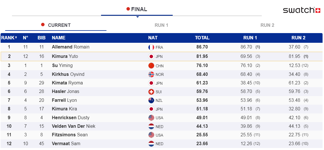 法国选手罗马-阿勒芒凭借第一轮的86.70分获得金牌,日本选手木村优斗依靠在第二跳81.95分获得银牌。