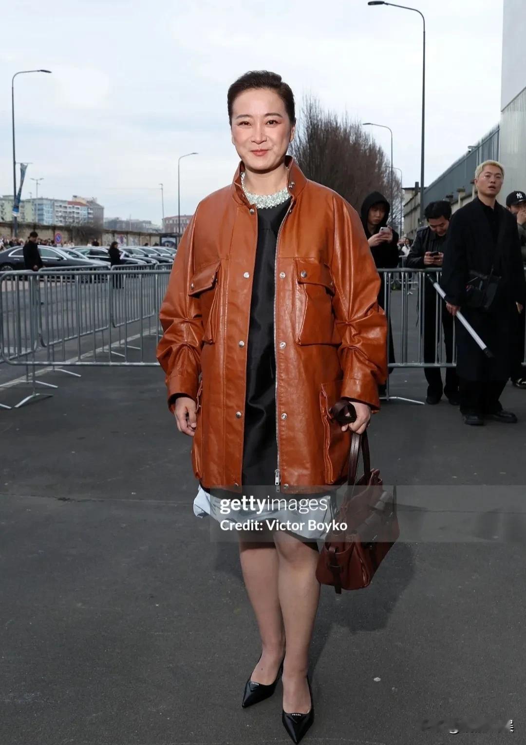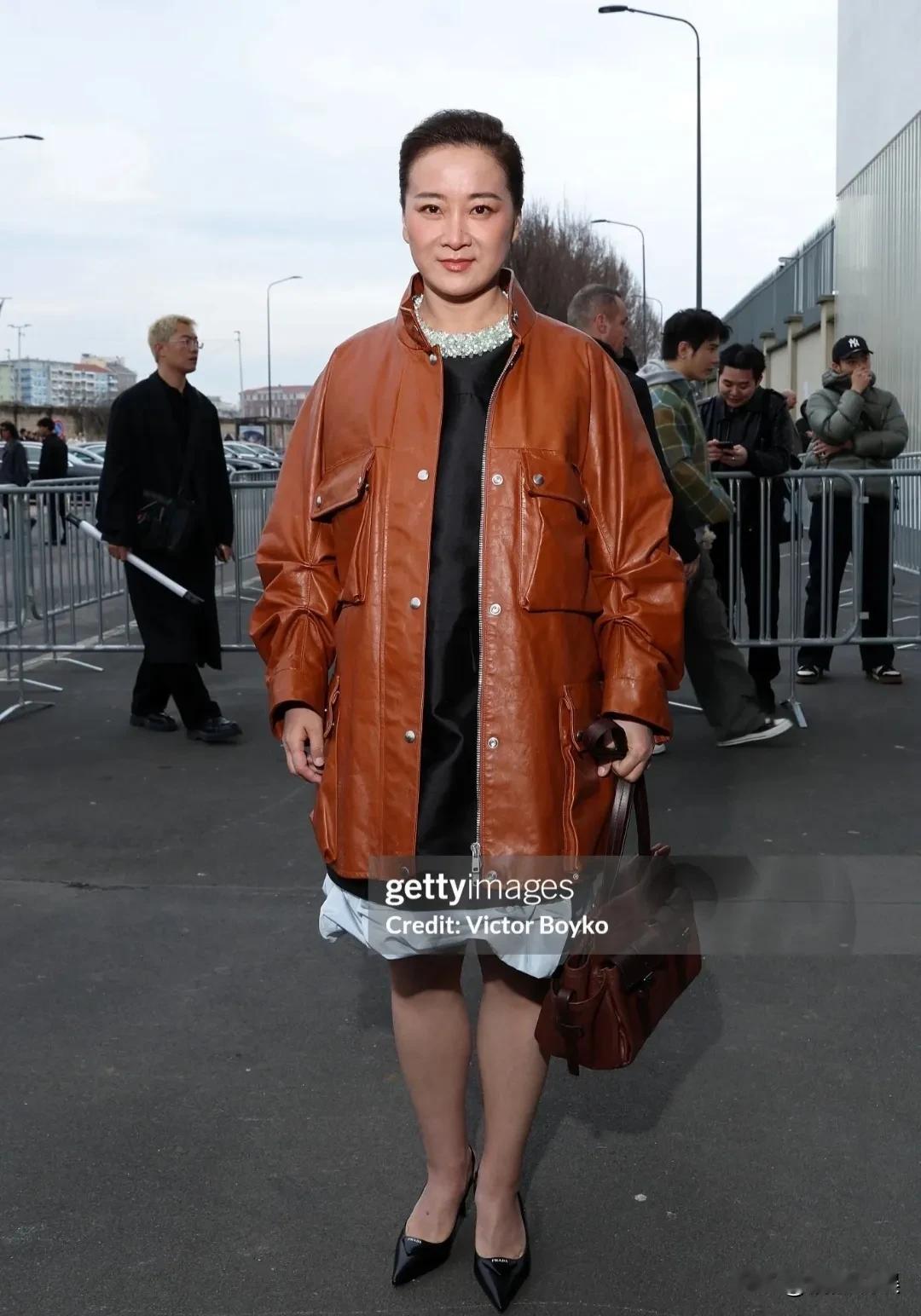 看一下外媒镜头下,贾玲参加时装周的生图,还是挺真实的! 梳着大背头的她,穿着棕色