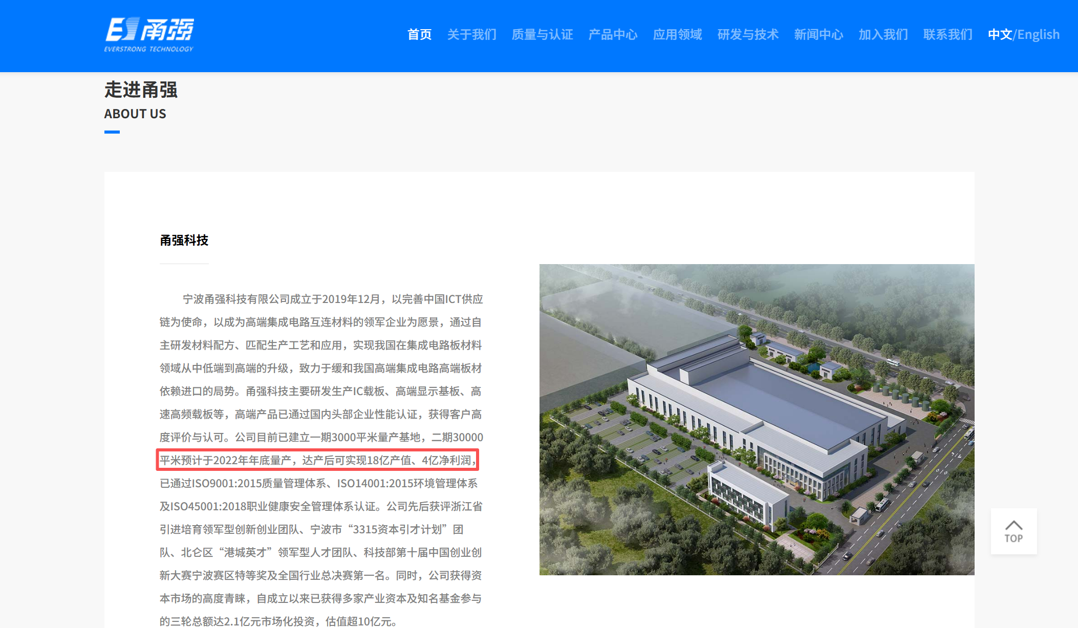 根据当时(1月4日)甬强科技官网信息,公司已建立一期3000平米量产基地,二期30000平米原计划于2022年底量产,达产后可实现18亿元产值、4亿元净利润。