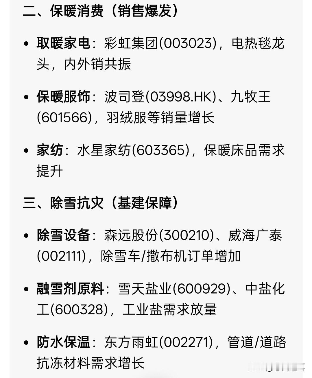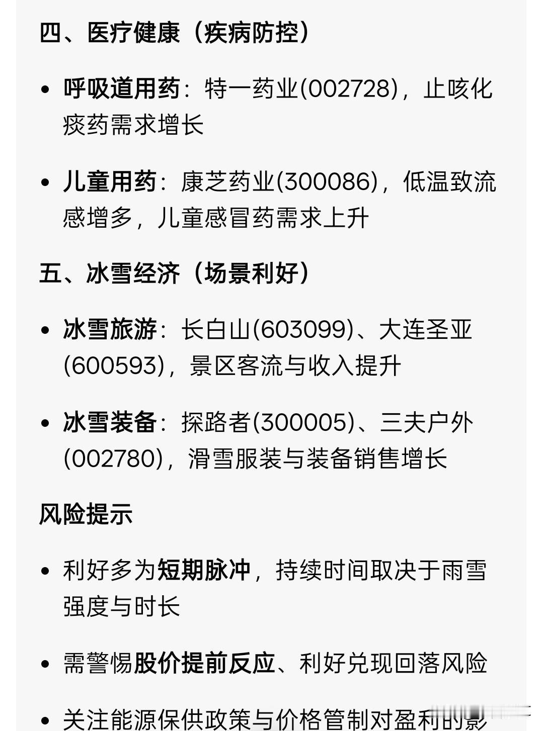 今天起全国迎来一次大规模的大雪、暴雪天,市场会不会有反应 刚刚问了一下AI,它给出了几个方向:大范围雨雪天气利好的上市公司集中在能源供暖、保暖消费、除雪抗灾、医疗健康、冰雪经济五大领域。 权当玩笑看看吧 就目前的市场炒概念这个风格,说不定相关板块会有一些个股有表现机会 不过就算有,也不要恋战,毕竟这不是主流,顶多是两三天行情。