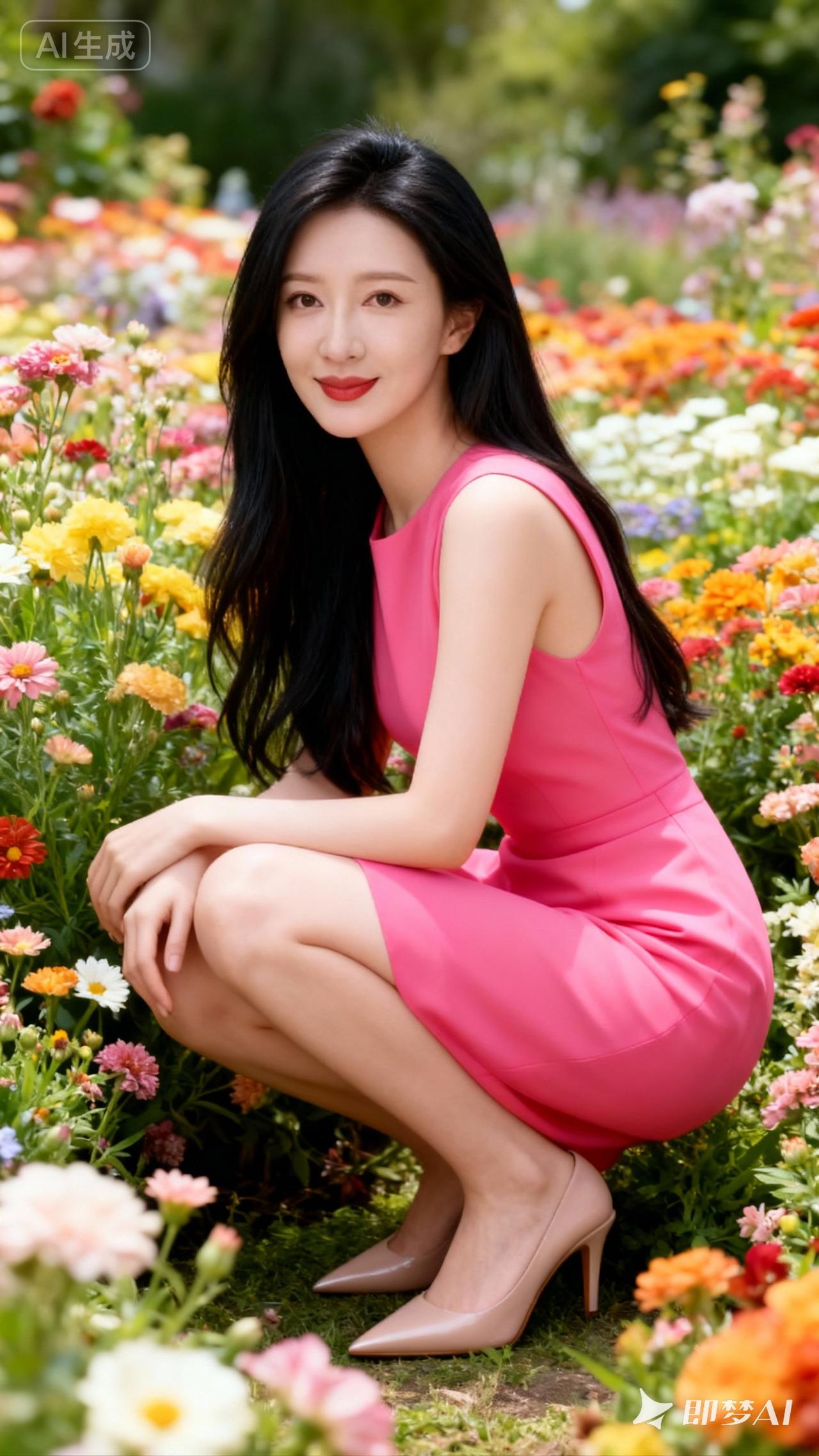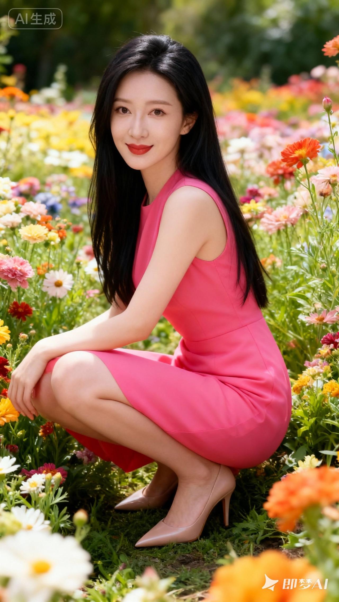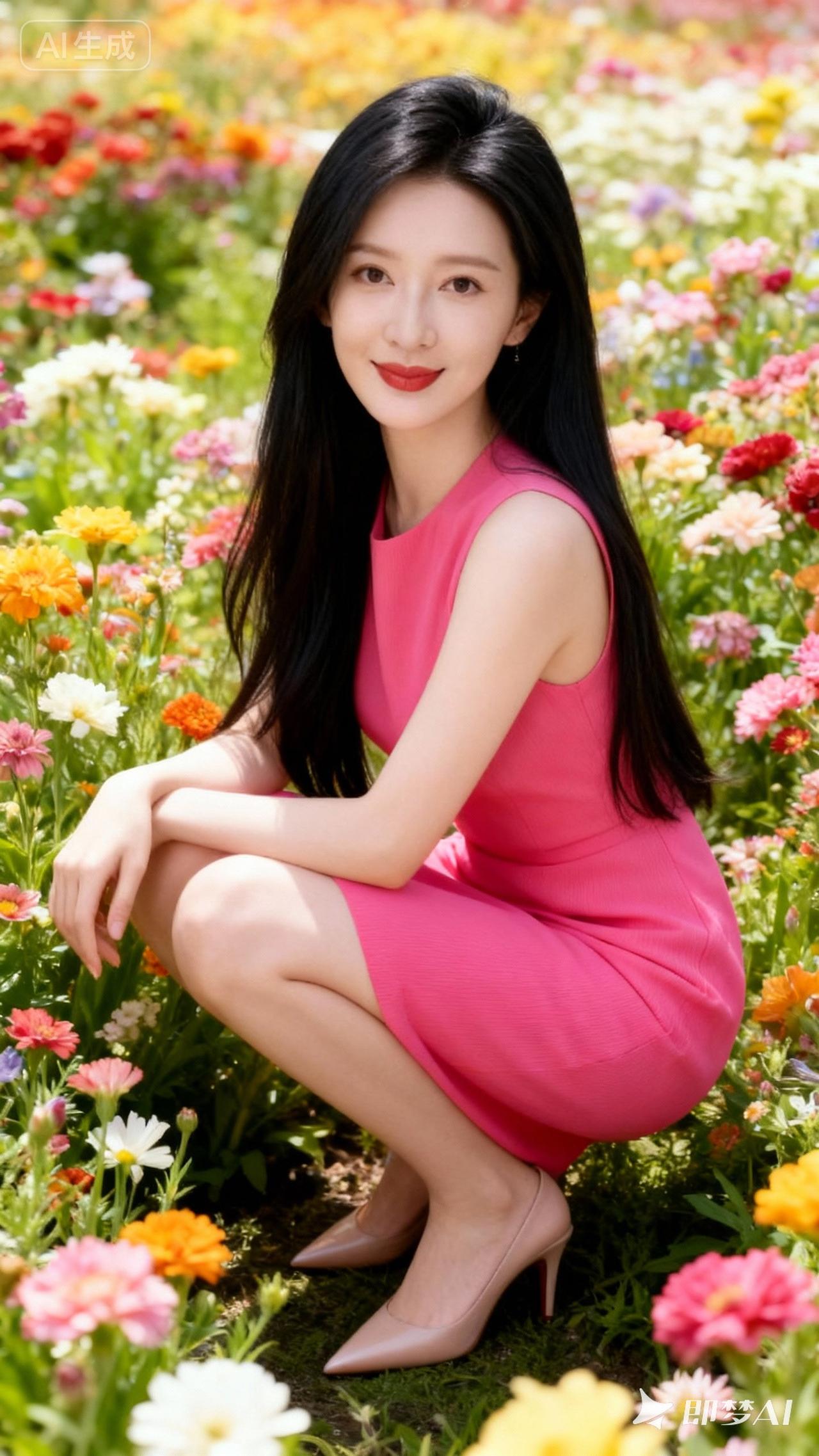 粉裙少女在花海中微笑,美得像一幅画!🌸💕
