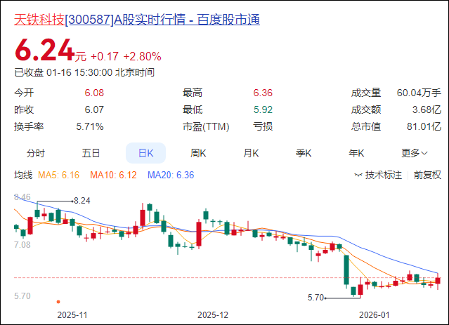 该公告披露第二天,2025年12月26日,天铁科技股价跌13.43%,收报6.06元/股,此后股价一直不温不火。至今年1月16日收盘,天铁科技报6.24元/股,较2025年12月25日收盘价7元跌幅达10.86%,市值蒸发9.88亿元,最新市值为81亿元。