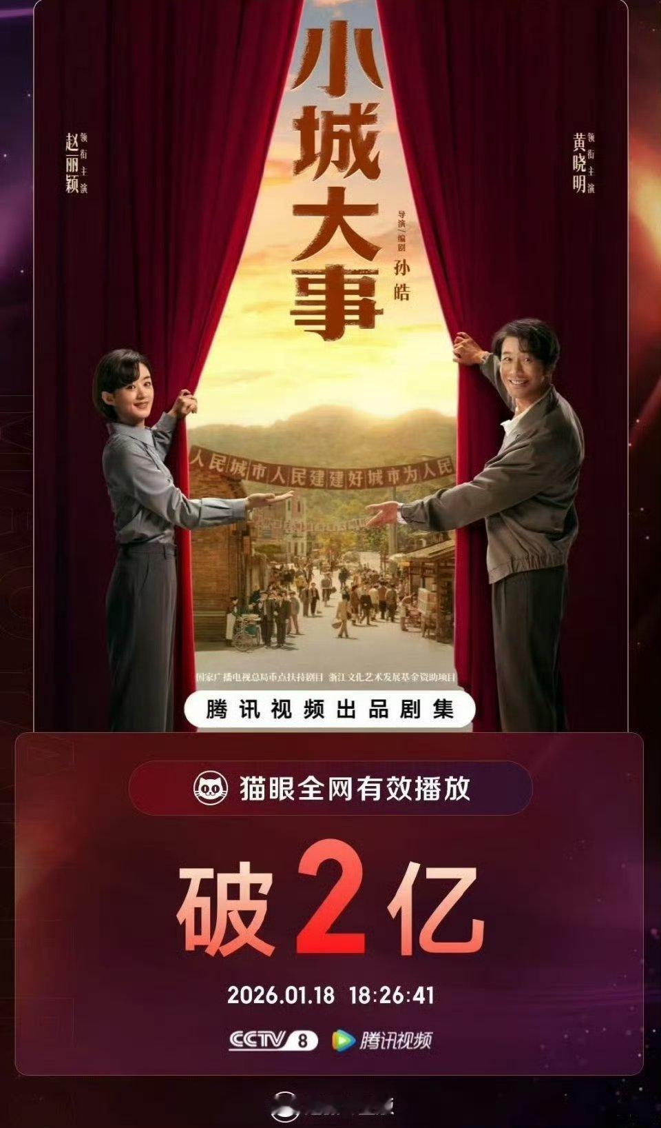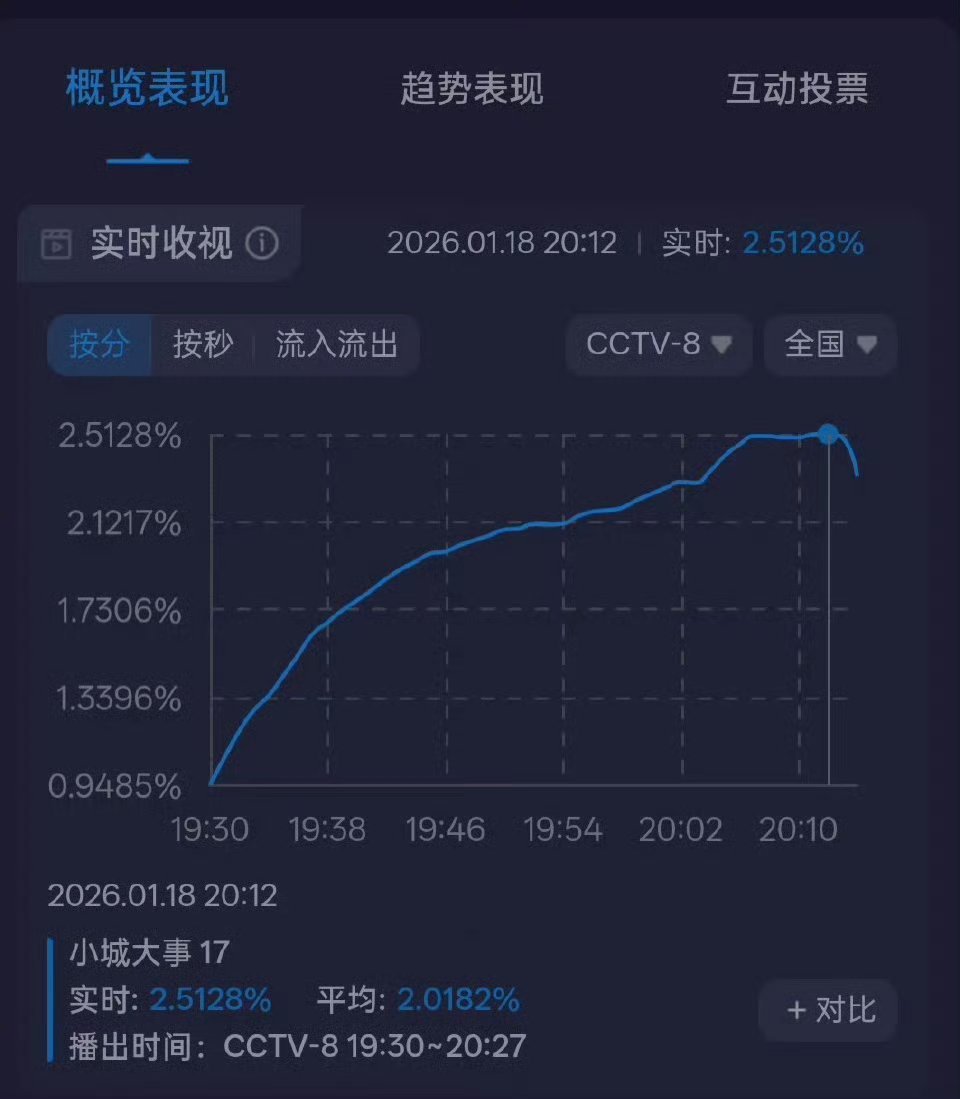 小城大事腾讯站内热度值破27000了,酷云收视率均值也破2,各数据都非常亮眼