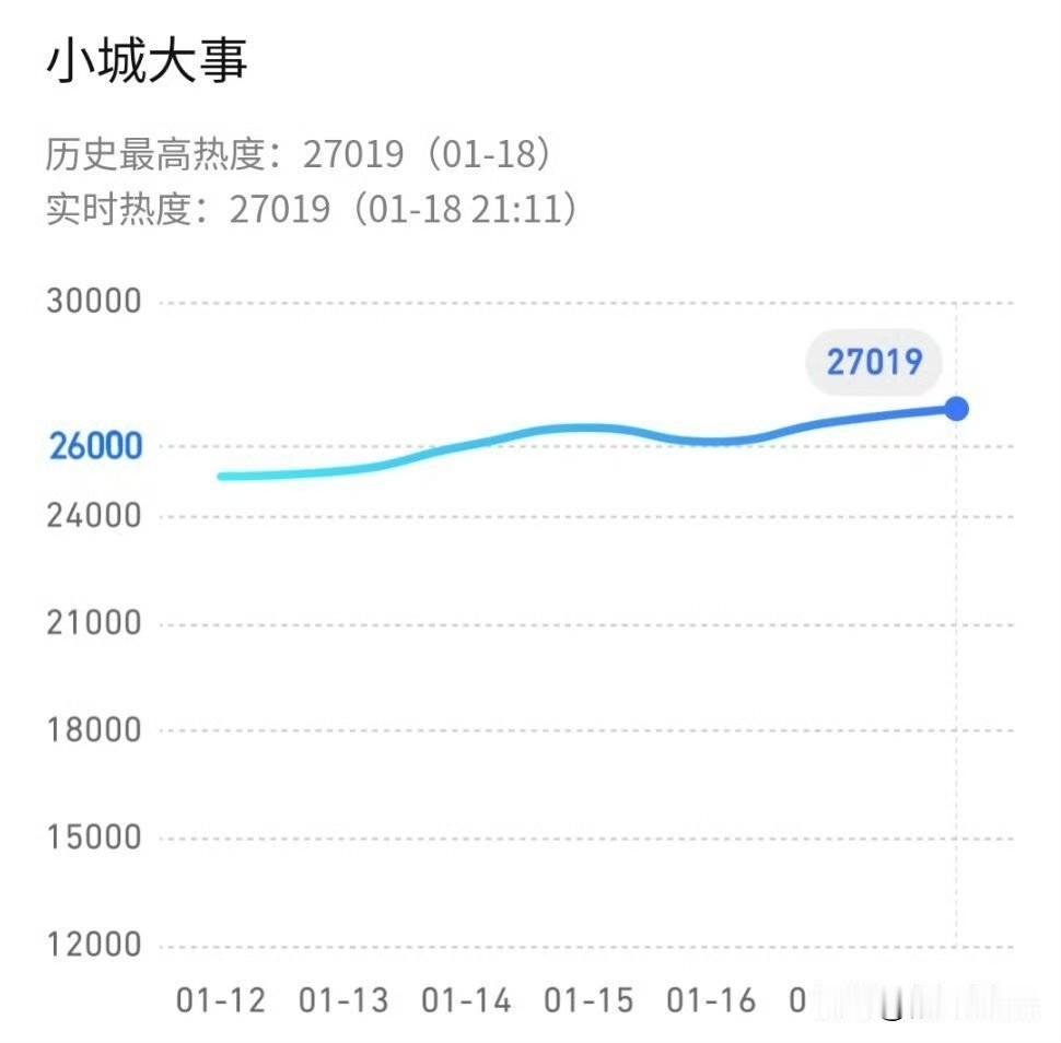 1月18日,赵丽颖《小城大事》热度破27000,剧情好看,观众自然会入场! 事实证明,剧还是得需要有cp线才能盘活儿,赵丽颖秦俊杰分手一个热搜,和好一个热搜,cp粉还有路转粉就刷刷刷入场了,保持这个状态,继续加油,破3不是问题! 一天500热度增长趋势,争取一周内破30000,希望后面赵丽颖秦俊杰感情戏份再多一些,最好大结局再有跟黄晓明的情感线变动