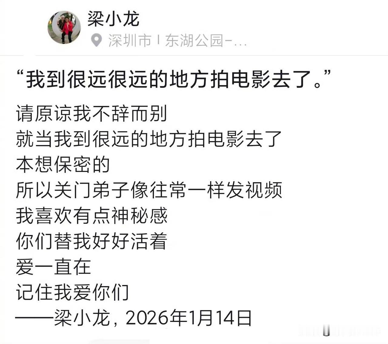 1月18日,梁小龙账号发文原谅我不辞而别 一句本来想保密的,就当我到很远的地方拍