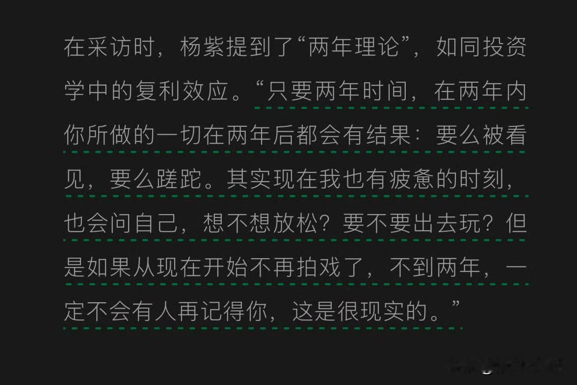 1月18日,杨紫的“两年理论”,让我理解了她为什么身处顶流,还要坚持一年拍三部戏 杨紫说现在她也有疲惫的时候,也会问自己,想不想放松?要不要出去玩? 答案是不想,不要!原因很现实,“如果现在开始不拍戏了,不到两年时间,一定不会有人再记得你”,这话说的相对比较绝对,但我能明白杨紫想表达的意思,内娱确实是这样,很多艺人不拍戏后,逐渐没了热度,观众永远都是那些观众,旧人不出现,新人就会吸引她们的目光,大家的注意力就会转移到新人身上,我觉得杨紫的两年理论,或许跟她之前的经历有关,两年不拍戏跟两年不播戏,对演员热度都有大幅度减弱 杨紫的戏又是拍一部播一部的状态,如果她不坚持拍摄,后续就没有存货可以在她休息的时候播出,填补她休息时的热度保持
