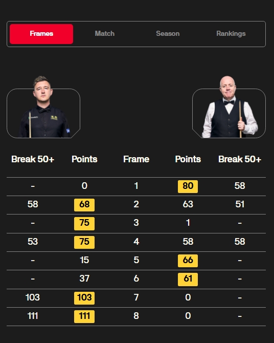 凯伦·威尔逊打出单杆111、103、58、53分,约翰·希金斯打出单杆58、51、58分。威尔逊3-1抢占先机。