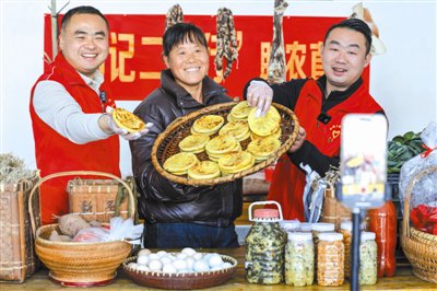 2026年1月16日,在安徽省黄山市歙县杞梓里镇西村村,村书记赵军(左)与驻村第一书记方依严(右)通过直播平台,热情地帮助农户销售农产品。
