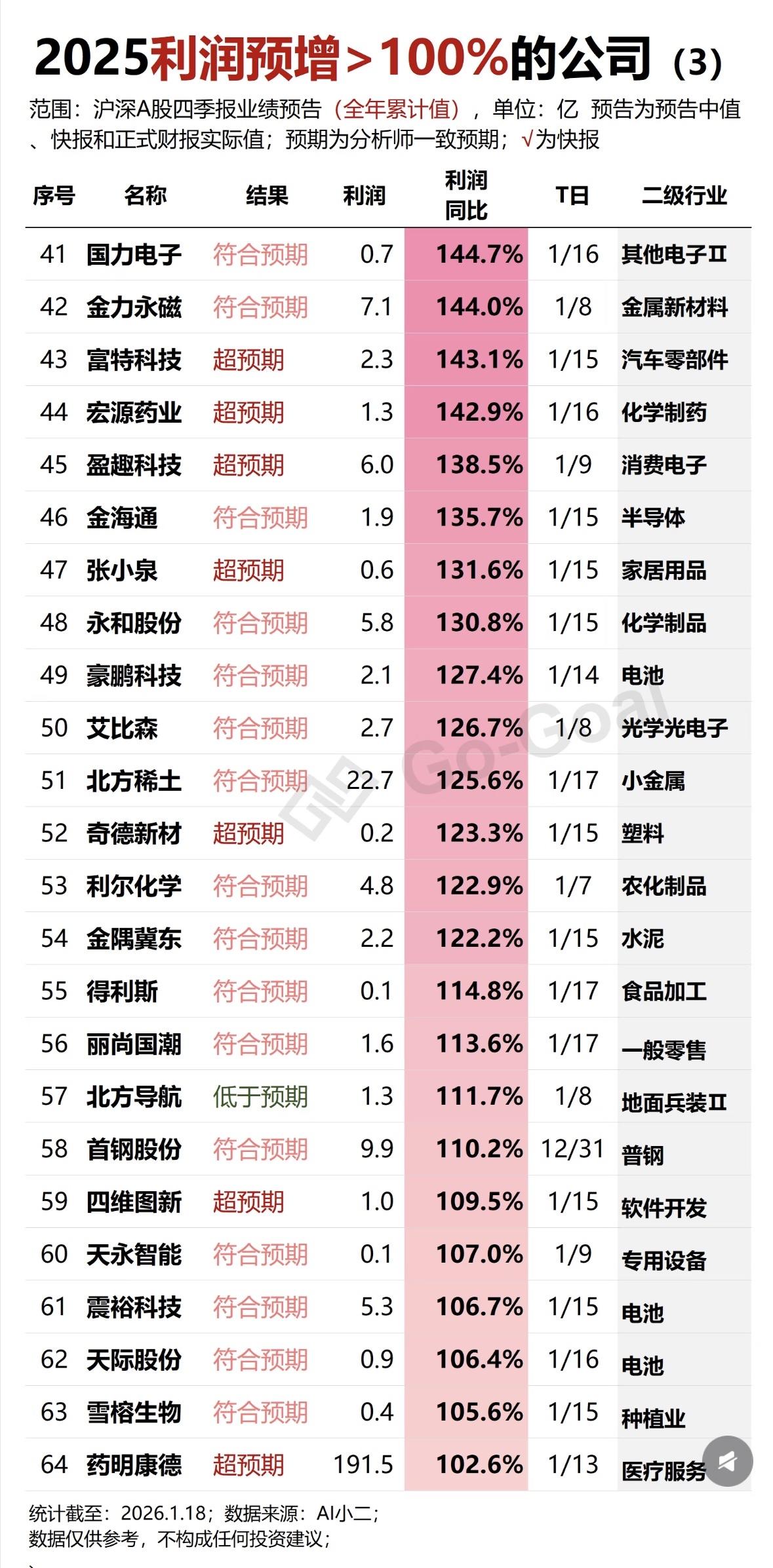2025年利润增长超100%的潜力股公司盘点! "多行业龙头利润暴增,生物科技、半导体、汽车板块领跑,超预期增长成亮点。" 沪深A股多行业利润预增超预期,生物、半导体、汽车等板块表现亮眼,投资需谨慎参考。