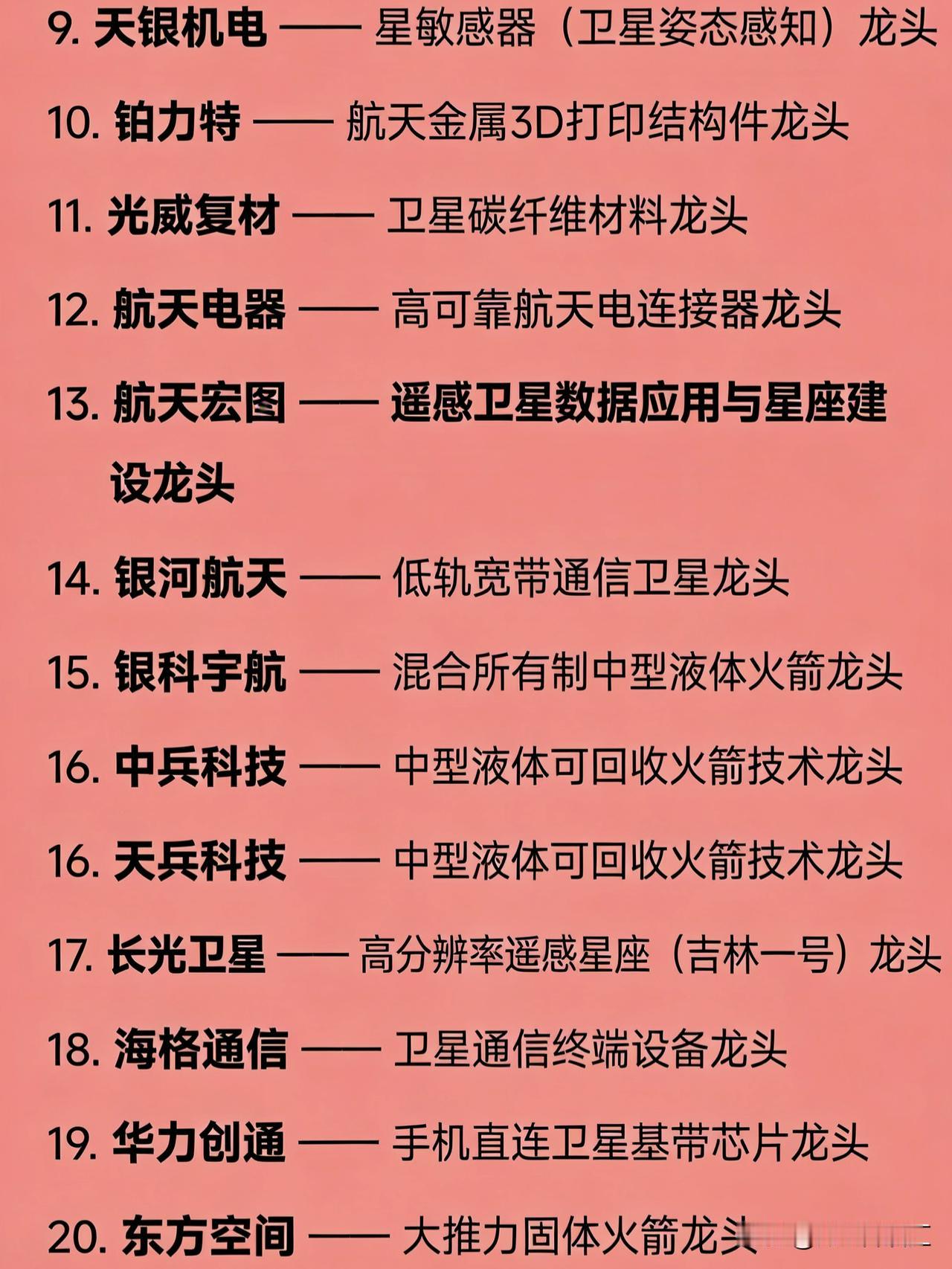 商业航天领域20家核心龙头企业 中国卫星 —— 卫星整机制造龙头 中国卫通 —— 卫星通信运营龙头 蓝箭航天 —— 民营液氧甲烷可回收火箭龙头 星河动力 —— 民营固体火箭发射龙头 航天电子 —— 火箭/卫星测控与电子系统龙头 航天动力 —— 液体火箭发动机龙头 铖昌科技 —— 星载T/R芯片龙头 臻镭科技 —— 卫星射频与电源管理芯片龙头 天银机电 —— 星敏感器(卫星姿态感知)龙头 铂力特 —— 航天金属3D打印结构件龙头 光威复材 —— 卫星碳纤维材料龙头 航天电器 —— 高可靠航天电连接器龙头 航天宏图 —— 遥感卫星数据应用与星座建设龙头 银河航天 —— 低轨宽带通信卫星龙头 中科宇航 —— 混合所有制中型液体火箭龙头 天兵科技 —— 中型液体可回收火箭技术龙头 长光卫星 —— 高分辨率遥感星座(吉林一号)龙头 海格通信 —— 卫星通信终端设备龙头 华力创通 —— 手机直连卫星基带芯片龙头 东方空间 —— 大推力固体火箭龙头