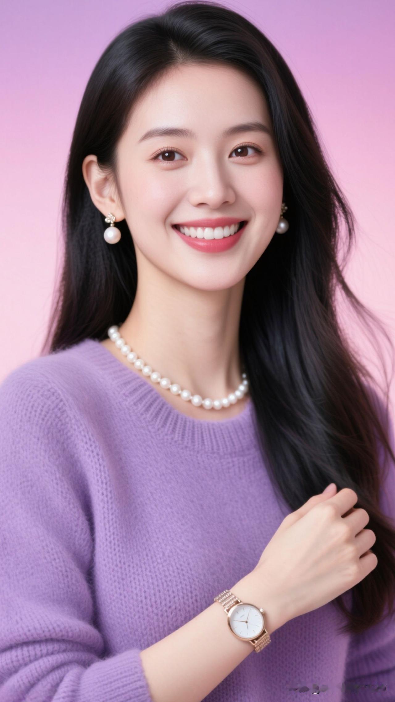 ⌛️ 腕表曳着金链的光,珍珠串起柔糯的诗,紫调里,每一缕暖意都妥帖得像个甜梦。轻