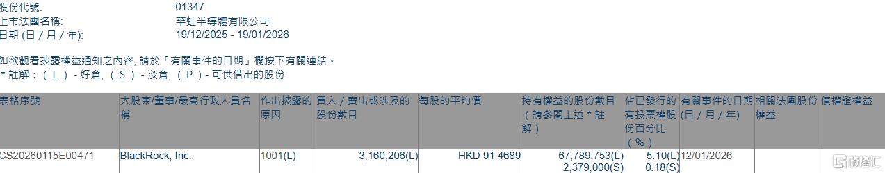 格隆汇1月19日丨根据联交所最新权益披露资料显示,2026年1月12日,华虹半导体(01347.HK)获BlackRock,Inc.在场内以每股均价91.4689港元增持好仓316.02万股,涉资约2.89亿港元。