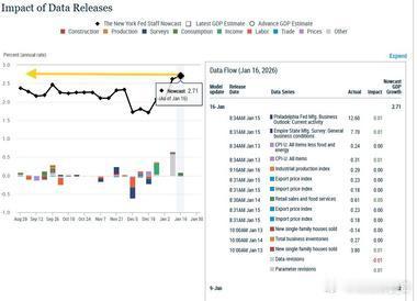 纽约联储的第四季度GDP预测模型(GDP Nowcast Tracker)升至自其2023年8月启动追踪以来的最高水平,最新读数为2.71%,较此前上调0.09个百分点,此次上调几乎完全源于零售销售数据的强劲表现。他们对2026年第一季度的GDP预测跟踪值本周环比上升0.13个百分点,达到2.75%,为自去年11月下旬启动该跟踪以来的最高水平。需要提醒的是,该模型在第三季度的预测值为+2.31%,远低于实际初值+4.3%;第二季度预测值为+1.68%,也低于最终公布的+3.0%。不过,在第一季度,该模型曾显著高估——预测值为+2.6%,而实际GDP却为-0.3%。(尽管在2025年之前的大多数季度里,该模型的预测通常更为接近实际值。)