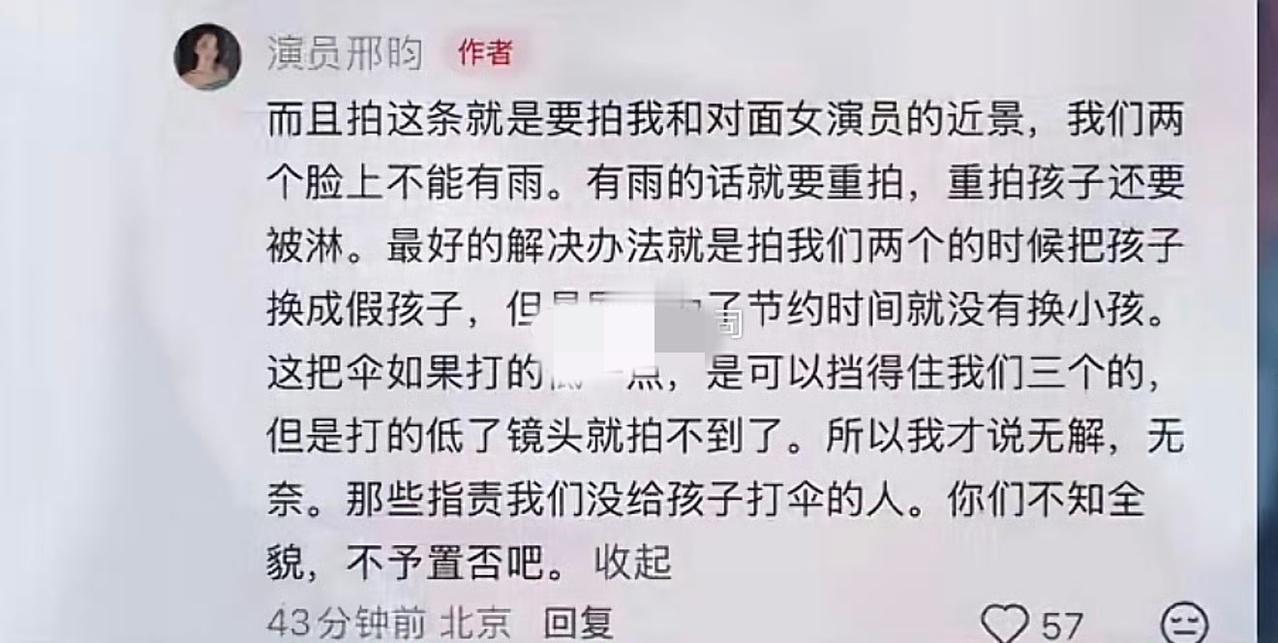短剧剧组让婴儿淋冷水雨?800片酬换撕心裂肺的哭,家长心也够大的! 谁看了不心疼!短剧演员回应不给婴儿打伞 直接冲上热搜爆榜,演员邢昀的爆料戳中全网怒点——深夜拍雨戏,洒水车浇着瓢泼冷水,背上的婴儿哭得撕心裂肺,剧组却为了省时间,拒绝用假孩子替换,就因为要拍成人演员的无雨近景! 更让人揪心的是,这场遭罪的戏,婴儿片酬才800块 !明明有简单的解决方案,却让毫无抵抗力的宝宝扛下所有,这哪是拍戏,分明是漠视生命!要知道广电总局1月初就发了《儿童类微短剧管理提示》,明确禁止让儿童出演超出身心承受能力的戏份,保障人身安全是底线 ,这剧组简直是顶风作案! 网友们炸了锅:“800块买孩子遭罪?家长和剧组都该反省!”“用假道具很难吗?赶进度也不能没良心!” 其实短剧追求爆款没问题,但不能把宝宝当“工具人”,艺术底线绝不能凌驾于生命尊严之上 。演员邢昀的发声特别正能量,敢说真话才是行业该有的样子! 你觉得剧组该为这事负责吗?如果是你,会同意孩子参与这类危险拍摄吗?评论区聊聊你的看法!