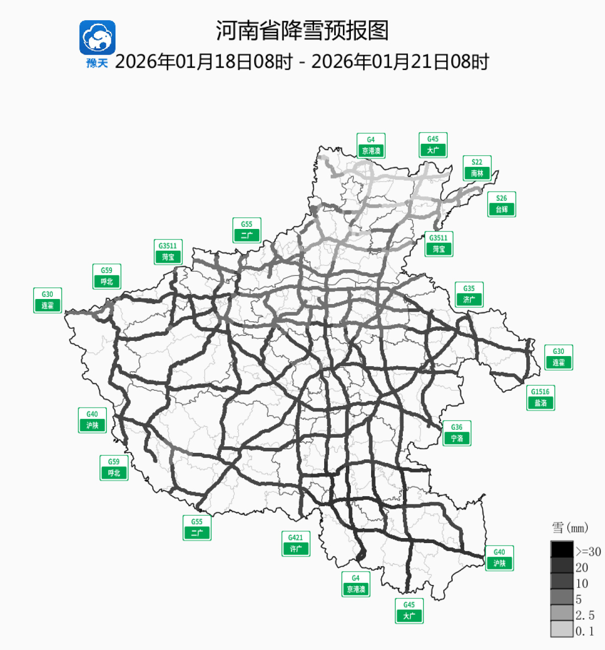 同时,本轮过程全省大部路表温度低于0℃,将出现对交通有较大影响的道路结冰,其中二广高速、荷宝高速、呼北高速、连霍高速、济广高速、盐洛高速、大广高速、宁洛高速、沪陕高速、京港澳高速、许广高速将出现对交通有较严重影响或严重影响的道路结冰。