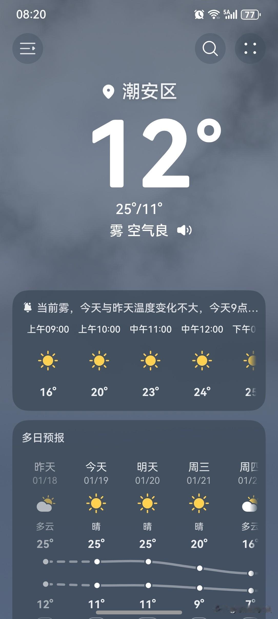 周二起广东迎大风降温天气! 今年首场大范围寒潮来袭,下周广东气温急速下降,粤北或有雨夹雪。 今天(19日),潮州喜提一个大好晴天,气温11~25℃,此刻气温12℃,体感温度11℃。 一起来看看今天的天空吧!早上依然有阳光,不过雾气似乎比昨天又重了几分,显得阳光没有那么明媚,但是没有关系,只要有阳光在线,用不了多久,多重的雾气都会消失殆尽。 气温方面,跟昨天差不多,早上的温度甚至比昨天高了一点点。或许是因为今天穿得少的缘故,体感微凉,但属于可接受范围。 今天的天气,依然值得拥有一个五星好评!这么温暖的时光所剩不多,冷空气一来,又是一波极速降温,像现在这么温暖的冬天也算是可遇不可求,得好好珍惜啊! 如此天气!元芳,你怎么看? [捂脸][我想静静][捂脸][捂脸][我想静静][捂脸][捂脸][捂脸][我想静静][捂脸]