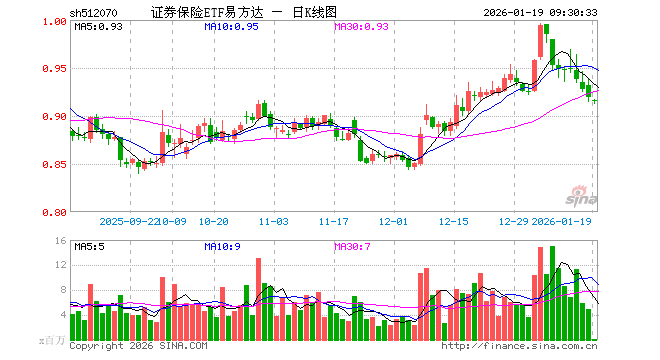 1月19日,证券保险ETF易方达(512070)开盘跌0.33%,报0.916元。证券保险ETF易方达(512070)重仓股方面,中国平安开盘跌0.08%,东方财富跌0.38%,中信证券跌1.21%,国泰海通跌0.20%,中国太保跌0.25%,华泰证券跌0.48%,中国人寿跌0.04%,广发证券跌0.71%,招商证券涨0.06%,东方证券跌0.10%。