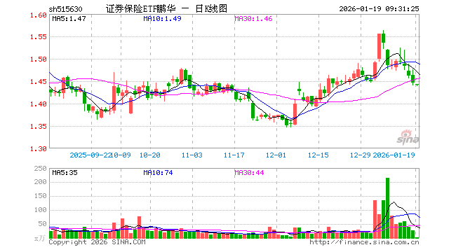 1月19日,证券保险ETF鹏华(515630)开盘跌0.21%,报1.443元。证券保险ETF鹏华(515630)重仓股方面,中国平安开盘跌0.08%,东方财富跌0.38%,中信证券跌1.21%,国泰海通跌0.20%,中国太保跌0.25%,华泰证券跌0.48%,广发证券跌0.71%,中国人寿跌0.04%,招商证券涨0.06%,东方证券跌0.10%。