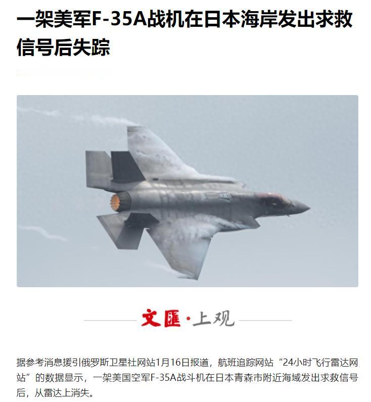 到处耀武扬威的美军,终究被“上天”收拾了! 1月16日上午,一则炸裂消息传来:美国号称“全球最先进”的F-35A隐形战机,在飞往毗邻东海的日本青森附近敏感海域时,突然挂出“7700”紧急代码,这可是意味着“死神叩门”的致命警报啊!可短短10秒后,战机就从雷达上彻底消失,连一句完整的呼救都没留下。 这架F-35A隶属于驻日美军三泽基地,当时正执行常规训练任务。事发时间锁定在北京时间11时09分,失联点位于三泽基地东北135公里处的海域。这片海域不算陌生,2019年日本航空自卫队一架同型号F-35A就曾在此坠毁,那是全球首例该型机坠海事故。 美日双方第一时间启动联合搜救机制,美军印太司令部派出P-8A反潜巡逻机和“阿利·伯克”级驱逐舰,日本海上保安厅调动8艘舰艇及多架搜救直升机,双方展开拉网式排查。搜救范围很快覆盖逾1200平方公里海域,可初期并未发现任何有效线索。 直到当日19时23分,搜救队才在事发海域找到战机的垂直尾翼残骸和部分机身碎片。残骸周边检测到明显油污带,初步判定为战机燃油泄漏所致。美军随即确认战机已坠毁,可机上唯一的飞行员至今仍未找到,弹射座椅也未启动,无任何跳伞目击记录。 事发海域的环境让搜救难度陡增,当前海水温度仅有2至5℃,人体在这种低温海水中生存时间不超过1小时。这片海域海底地形还十分复杂,遍布陡坡与沉积沟壑,再加上冬季盛行东北季风,海面常伴3至4米涌浪,水下作业窗口极为有限。 飞行员生还概率已无限趋近于零,美日联合搜救队虽保持24小时不间断作业,却始终没能捕捉到飞行员的生命体征信号,黑匣子也尚未定位。按照目前进度,黑匣子打捞工作或许要持续数周,事故具体原因还需等待数据解锁后才能确认。 这起事故绝非偶然,F-35系列战机自服役以来就问题不断,各类故障和事故频发。2025年1月,一架F-35A在阿拉斯加坠毁,调查结果指向液压系统结冰。2022年12月,冲绳基地一架F-35A因起落架故障被迫机腹着陆。2018年,该机型还曾因发动机油管故障发生首次坠机事故。 除了机械故障,F-35系列的弹射座椅隐患早已埋下。2025年6月,美军就因弹射座椅爆炸药筒装药量不足,停飞百余架F-35战机。更早的2015年,该机型弹射座椅还被曝出低速飞行弹射时,会导致体重较轻飞行员颈部受损,美军为此限制了驾驶该机型的飞行员体重。 此次事发前,机组并未上报机械异常。军事专家结合过往案例分析,不排除液压故障、航电失灵或操作失误等可能。F-35A作为第五代隐身战机,集成了大量先进技术,系统耦合度极高,对维护精度和软件稳定性的要求极为苛刻。 可美军为了维持全球霸权,频繁在海外部署该机型,一线基地的维护规程往往难以严格落实。此次出事的三泽基地,原计划2026年春季完成48架F-35A部署,替换老旧的F-16C/D战机。这起事故大概率会导致部署计划延迟。 日本自卫队已紧急停飞现有12架F-35A,全面开展安全排查。更让美日焦虑的是技术外泄风险。F-35A核心技术高度敏感,残骸若长期无法打捞,可能被其他国家获取关键信息。美日已增派反潜力量封锁海域,严防无关船只靠近。 美军总爱带着先进装备在世界各地耀武扬威,动辄炫耀所谓“全球作战能力”。可这架F-35A的坠毁,再次暴露了其装备可靠性不足、海外部署隐患重重的问题。所谓“全球最先进”,终究扛不住自身缺陷与恶劣环境的双重考验。 不是“上天”刻意收拾美军,而是美军过度扩张的军事行动,本就放大了装备隐患和环境风险。这起事故不过是美军全球霸权扩张路上的又一个警示,再先进的武器,脱离了可靠的维护和理性的部署,终究只会自食恶果。目前美日搜救仍在继续,后续调查结果值得持续关注。