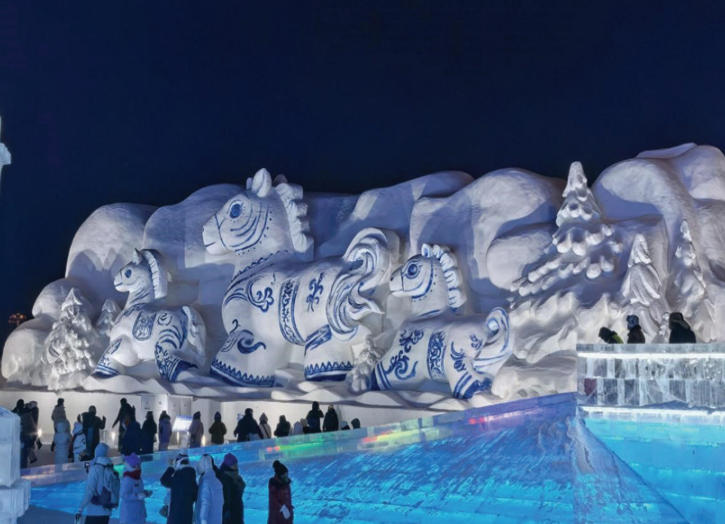 传统与新潮的碰撞在园区内巧妙上演。从成都专程前来体验冰雪的一对情侣对青花瓷系列马主题雪雕赞不绝口:“在雪上看到青花瓷纹样,这种搭配太亮眼啦!青花瓷马雪雕动态感十足,好像真的在雪原上奔跑,远观的视觉冲击力更大,没想到冰雪还能这样展示中国文化。”