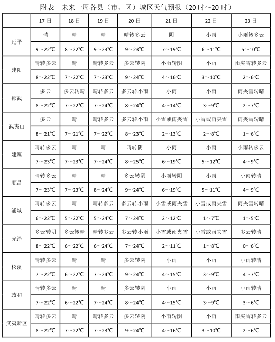 据南平气象预报,预计16~19日我市以晴到多云天气为主。受低层切变和强冷空气共同影响,20~23日我市有一次明显降温伴降水天气过程,最低气温过程降温幅度7~10℃;极端最低气温出现在24日凌晨,可达-3~1℃,高山区更低,夜晨有霜或霜冻,中北部及高山区有结冰;20~23日有小雨,其中21日至23日凌晨北部及高山区有小雪或雨夹雪。