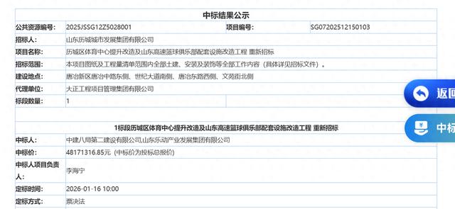 1月16日,济南公共资源交易中心发布了历城区体育中心提升改造及山东高速篮球俱乐部配套设施改造工程重新招标(下称“历城区体育中心项目”)中标结果公示公告。