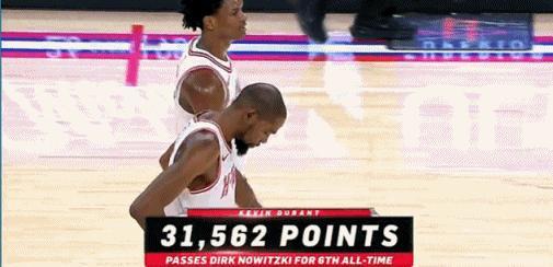 用金鸡独立的方式超越诺维茨基, 用伟大致敬伟大, 杜兰特还是懂人情世故的! 今天火箭对阵鹈鹕的比赛中,杜兰特得到18分,NBA生涯总得分来到了31561分,一举超越了诺维茨基,排名历史总得分榜第6! 杜兰特今天高情商啊……杜兰特追平诺维茨基得分的进球方式恰巧使用了诺维茨基的招牌得分动作金鸡独立,太漂亮了。 相信诺维茨基看到这一幕也会为杜兰特起立鼓掌。 为杜兰特的这个行为点赞,真的做得太棒了👍👍👍