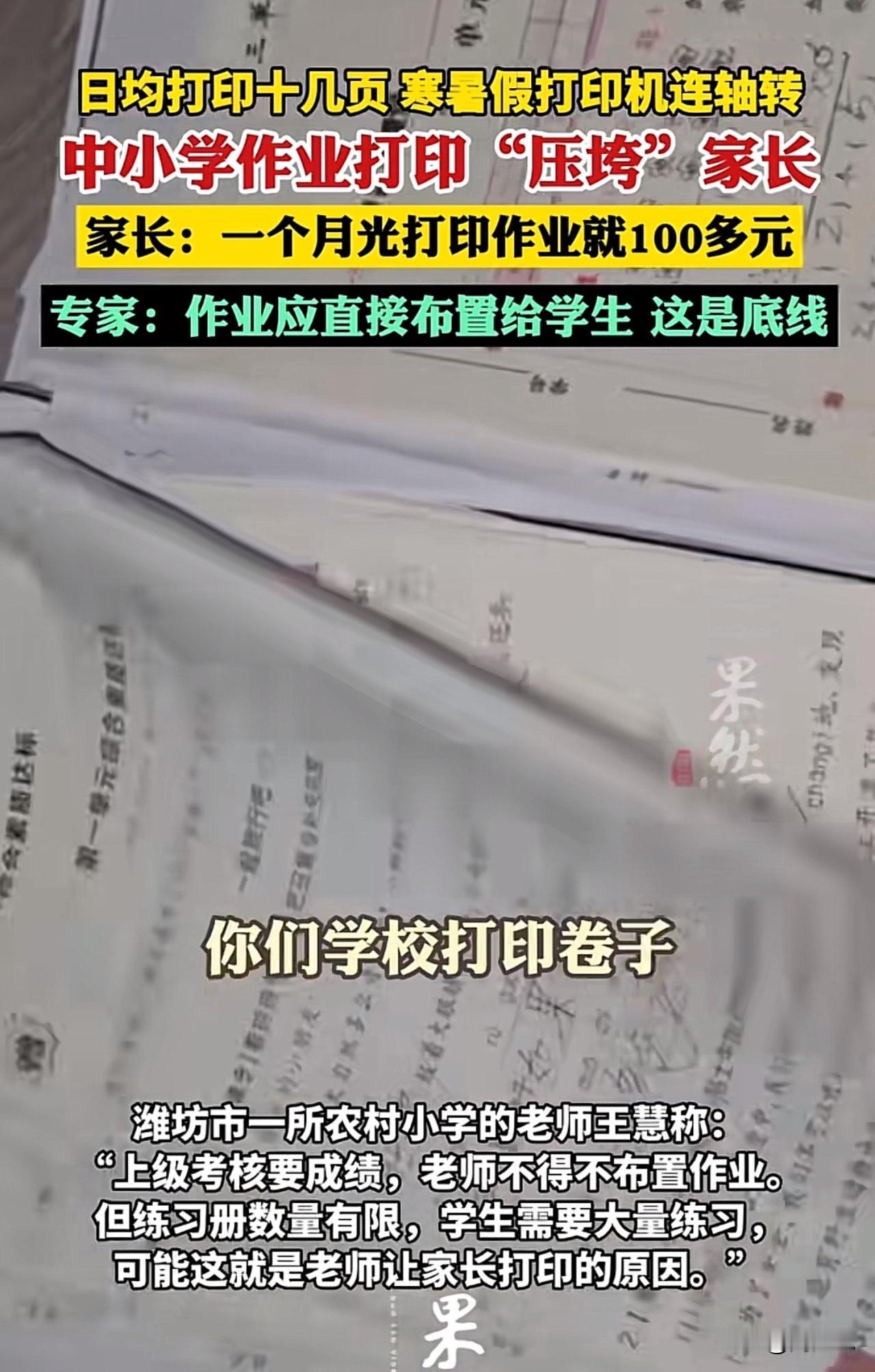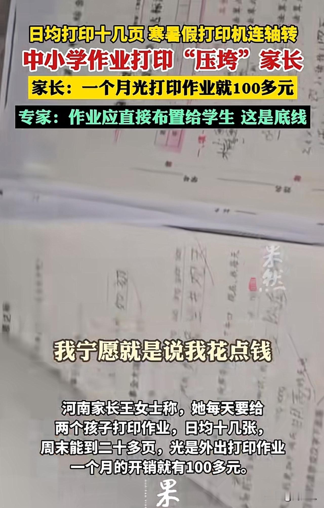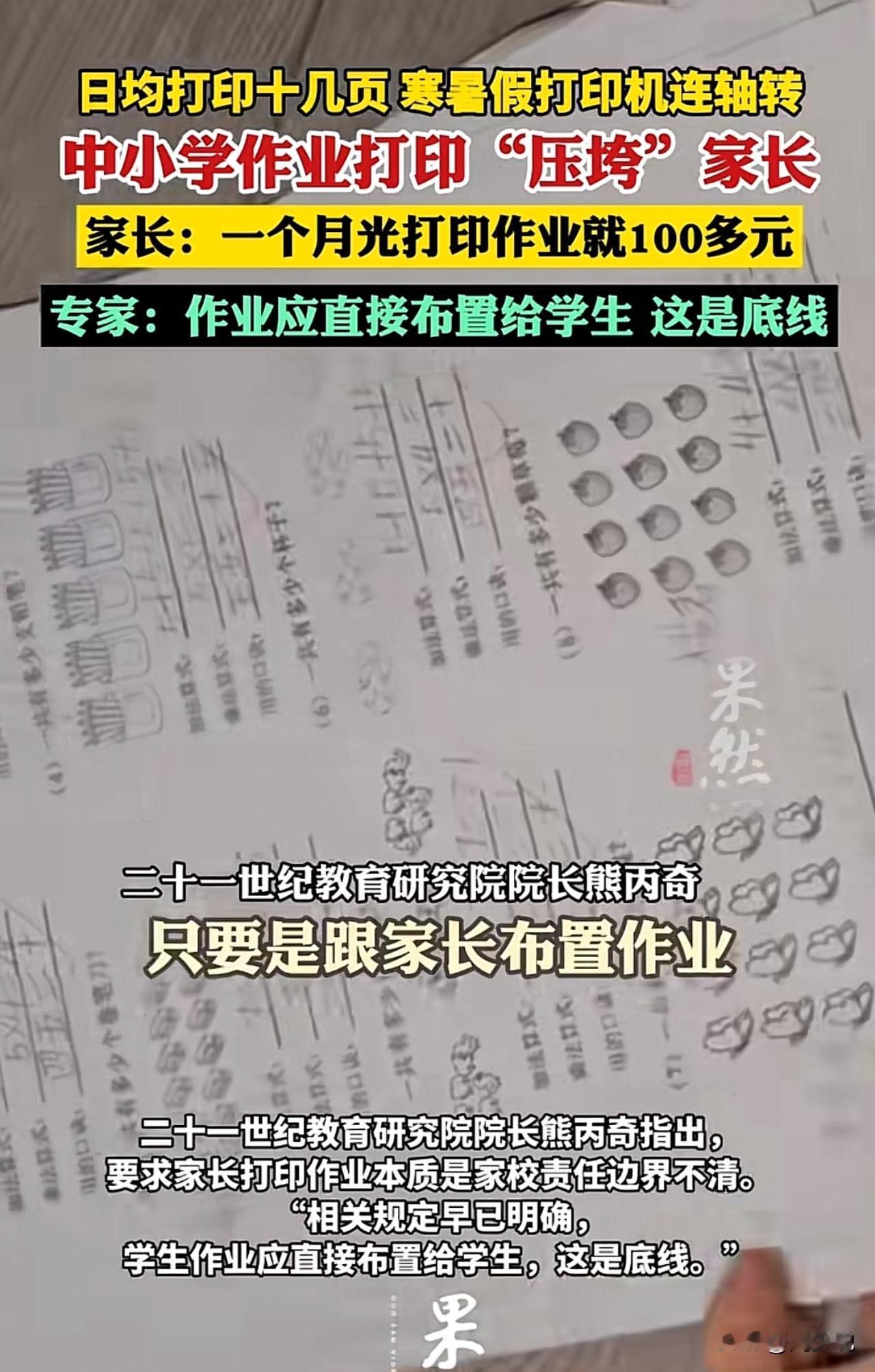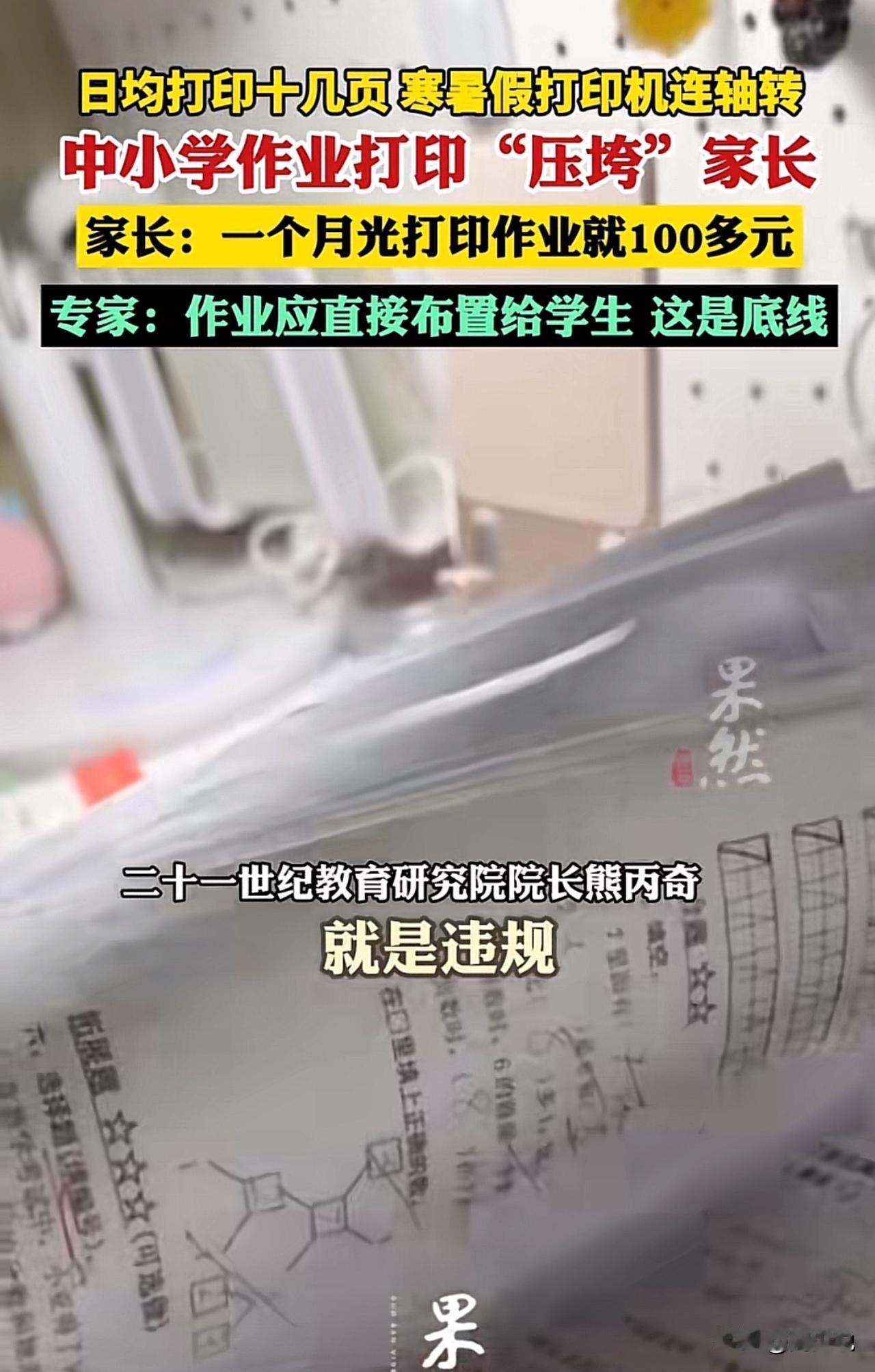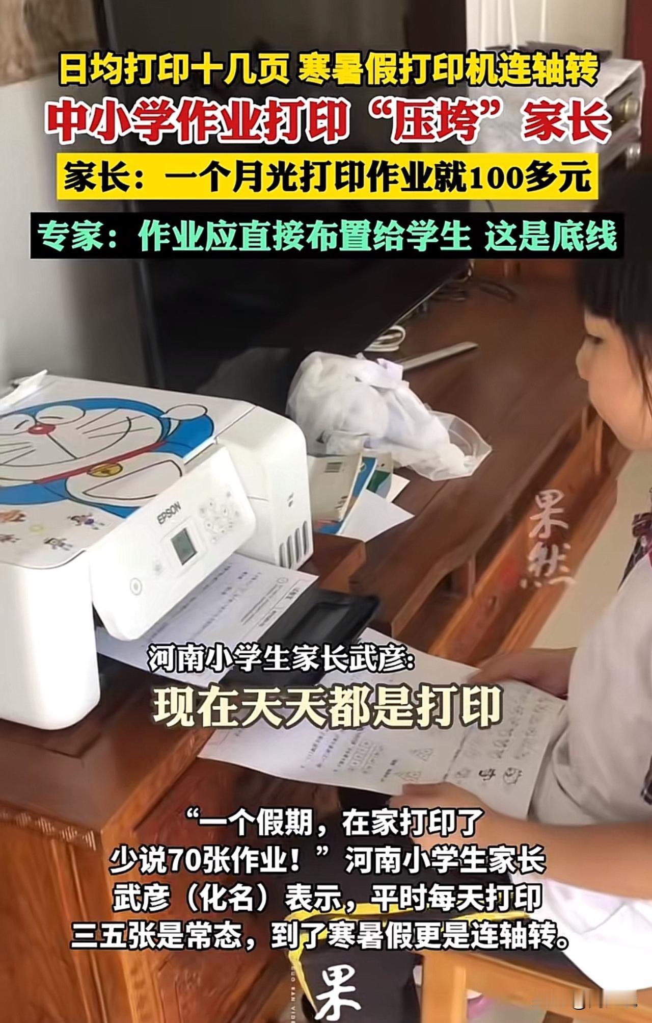 “这届家长太不容易了!”近日,不少家长纷纷吐槽:孩子上学,家长成了全职打印员。家里打印机寒暑假连轴转,平时日均打印十几页,一个月光打印费就超百元,实在吃不消。 此事曝光后,网友纷纷吐槽:“现在没个打印机,都不配当家长了”! 也有网友质疑:“作业布置给学生,为啥要家长来跑腿打印”。 针对此情况,有专家坦言:“要求家长打印作业,本质是家校责任边界不清。相关规定早已明确,学生作业应直接布置给学生,这是底线。” 而有老师则回应称,“上级考核要成绩,老师不得不布置作业。但练习册数量有限,学生需要大量练习,可能这就是老师让家长打印的原因。” 这是看下来,周少非常同意专家的看法,要求家长打印作业,本质上是家校责任边界不清,这就要从根本上解决问题,更不能突破底线。 作业的本质是检验孩子的学习成果,让家长代劳打印,不仅违背了作业设计的初衷,还容易让孩子养成依赖心理。 而且,教育不该给家长加码,学校应主动承担起相应责任,比如开放校内打印资源,或是优化作业形式,减少不必要的纸质打印需求,让教育回归育人本质,而不是给家长制造额外负担。#寻美三湘# #长沙新朋友#