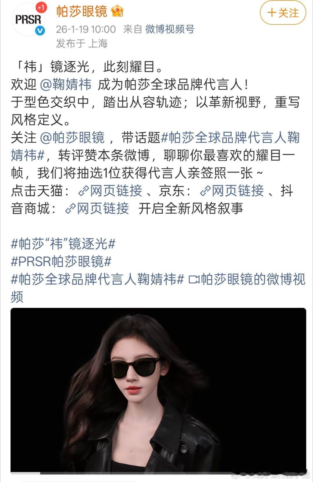 鞠婧祎正式官宣帕莎全球品牌代言人