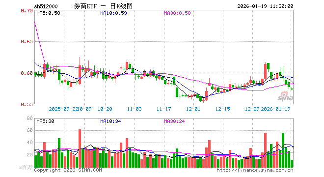 1月19日,截止午间收盘,券商ETF(512000)跌0.69%,报0.573元,成交额6.94亿元。券商ETF(512000)重仓股方面,东方财富截止午盘跌1.59%,中信证券跌1.14%,国泰海通跌0.50%,华泰证券跌1.34%,广发证券跌1.68%,招商证券跌0.54%,东方证券跌0.19%,申万宏源跌1.35%,兴业证券跌0.73%,中金公司跌0.03%。