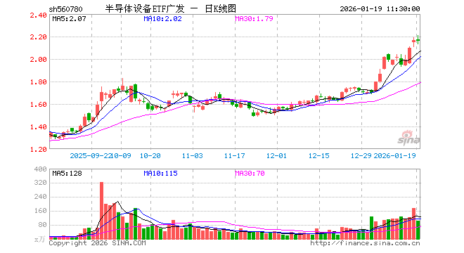 1月19日,截止午间收盘,半导体设备ETF广发(560780)跌0.09%,报2.162元,成交额2.20亿元。半导体设备ETF广发(560780)重仓股方面,中微公司截止午盘涨1.62%,北方华创涨0.02%,长川科技跌1.01%,沪硅产业跌1.21%,华海清科跌0.83%,拓荆科技跌2.22%,安集科技跌3.06%,南大光电涨0.03%,芯源微涨2.52%,中科飞测涨0.43%。