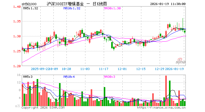 1月19日,截止午间收盘,沪深300ETF增强基金(561000)跌0.53%,报1.312元,成交额315.54万元。沪深300ETF增强基金(561000)重仓股方面,宁德时代截止午盘跌1.42%,贵州茅台跌0.28%,中国平安跌0.56%,立讯精密涨0.52%,紫金矿业跌0.88%,海光信息涨2.16%,中芯国际跌1.22%,东方财富跌1.59%,美的集团涨0.06%,长江电力涨0.83%。