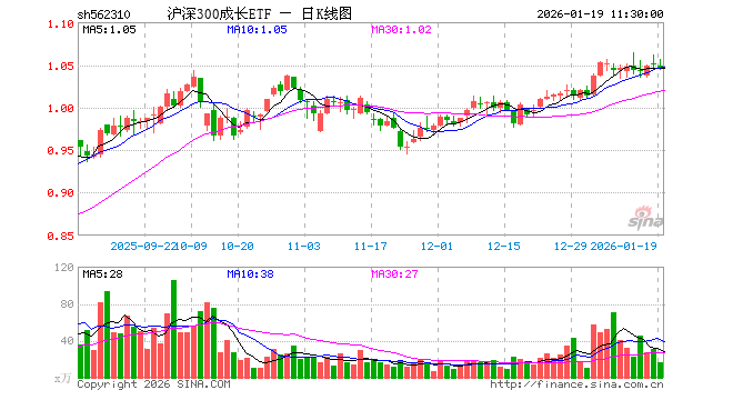 1月19日,截止午间收盘,沪深300成长ETF(562310)跌0.38%,报1.046元,成交额1765.75万元。沪深300成长ETF(562310)重仓股方面,宁德时代截止午盘跌1.42%,贵州茅台跌0.28%,紫金矿业跌0.88%,新易盛涨1.44%,中际旭创跌1.78%,立讯精密涨0.52%,恒瑞医药跌1.03%,比亚迪涨0.13%,药明康德跌2.77%,五粮液跌0.54%。