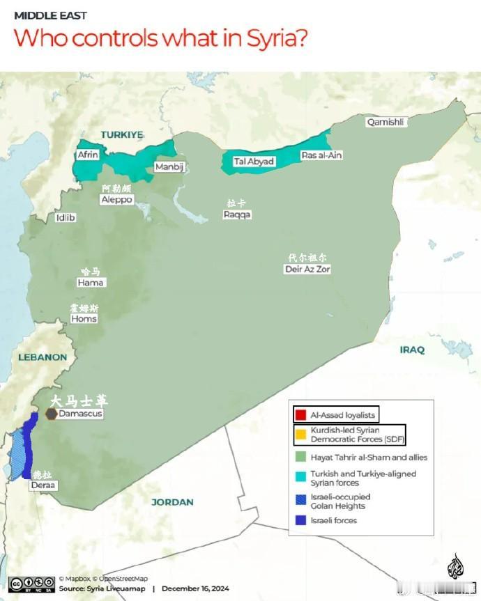 朱拉尼扫除大麻烦,敌对武装全面投降 综合外媒报道,叙利亚库尔德武装SDF宣布和朱拉尼的HTS政权签订停战协议。 这14条停战内容用一句话总结就是叙利亚的库尔德武装全面向朱拉尼政权“投降”,前者的所有管辖权全部移交给后者,前者的官员直接纳入后者的政府体系中,这意味着在阿萨德政权倒台后,叙利亚很有可能迎来“大统”(图1中紫色为SDF曾经控制的叙利亚区域)。 SDF作为叙利亚东北部最大的武装势力,一直是HTS在叙本地最大的对手之一,该组织此前还吸纳过一些前阿萨德政权的军官,一起对抗HTS的进攻,但随着SDF的“投降”,目前叙利亚大部分领土已经被HTS“统一”,只剩下北部被叙利亚控制的部分区域、南部被以色列支持的德拉武装控制的区域,以及以色列直接控制的戈兰高地(图2)。 投降后,库尔德武装SDF的总司令将担任叙哈塞克省的省长,其他SDF领导层将以“个人身份”,重新加入叙利亚国防部和内政部的架构,按照HTS的标准重新授予军衔和待遇。 另外,SDF除了纳出所有的军队、地盘,还要将叙利亚东北部现存的前阿萨德政权的军官名单交给HTS,也就是说,那些替SDF打击HTS的前叙利亚军官还是没躲过被出卖,有了这份名单,这些人未来被HTS清算的概率很高。 虽然有报道称SDF武装中的核心部队,库尔德“人民保护部队(YPG)”和“妇女保护部队(YPJ)”拒绝该协议,但对现在的他们来说,已经掀不起什么浪花了,整个SDF被HTS分散拆解已是大势所趋了。 其中的主要原因就是美国在HTS和SDF中,选择了前者,抛弃了对后者的支持。失去美国支持后SDF已经难以运作,只能举手投降。 而朱拉尼在扫除了SDF这个最大麻烦后,之后怎么和土耳其以及以色列相处,很有可能决定叙利亚的未来,若真能在美国、土耳其、以色列之间“多面逢源”,叙利亚没准真能从战争中重新站起来。
