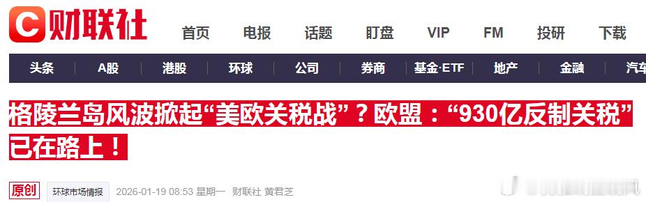 今日爆料:供链替代利好中国公司;格岛“美欧税战”欧盟反制路上导语:作者系《网易号》优质财经领域创作者。曾经原创作者和知名网易号旅游领域创作者。大跨度行业等的写作,颇受网友喜爱。作品发表于2026.01.19.11:28 优雅端庄晚风。【内容提要】财联社01月19日08:53电:格陵兰岛风波掀起“美欧关税战”?欧盟:“930亿反制关税”已在路上!对中国上市公司有什么利好?今日帮你深度透视:主题即是:今日爆料:供链替代利好中国公司;格岛“美欧税战”欧盟反制路上。一、龙头公司:产链上游全球供链重构但若剧情:冲突缓解:市场风险偏好回升,相关板块可能受益。画龙点睛:千题百炼:这几个产业链上游。确实有不:少硬核的中国公司。与你一起:梳理核心板块龙头。1、汽车产业链接上游第一、核心原材稀土磁材核心原材:锂、钴、镍、稀土磁材等。第二、龙头公司华友钴业龙头公司:赣锋锂业(锂)、华友钴业(钴)、金力永磁(稀土磁材)。2、电池产业:链接上游第一、动力电池正负材料。动力电池:隔膜、电解液、正负极材料。第二、龙头公司容百科技龙头公司:恩捷股份(隔膜)、天赐材料(电解液)、容百科技(正极材料)、璞泰来(负极材料)。第三、动力电池:全球龙头动力电池:宁德时代(全球龙头)。第四、汽车电子核心芯片汽车电子与芯片:均胜电子(智能座舱、安全系统)、韦尔股份(图像传感器)。第五、整车制造:全链布局整车制造:比亚迪(全产业链布局)。3、机械产业:链接上游第一、核心零件伺服系统核心零部件:减速器、轴承、精密齿轮、伺服系统。第二、龙头公司汇川技术龙头公司:绿的谐波(谐波减速器)、中大力德(精密减速器)、双环传动(精密齿轮)、汇川技术(伺服系统)。4、电子产业:链接上游第一、半导材料半导硅片半导体材料:沪硅产业(半导体硅片)、雅克科技(光刻胶、电子特气)。第二、半导设备刻蚀设备半导体设备:北方华创(刻蚀机、PVD、CVD等)、中微公司(刻蚀设备、MOCVD设备)。第三、半导设计图像传感半导体设计:海思半导体(未上市,华为旗下)、韦尔股份(图像传感器)。二、格岛风波:核心美国用关税当“大棒”1、欧盟直接:反制清单美国霸凌:逼欧国家:同意它买下格陵兰岛。结果欧盟:直接甩出一份930亿美元的反制关税清单回敬,双方硬刚上了。2、事件起因:“关税勒索”追寻源头:特朗普政府:以“国家安全”为由,宣布从2026年2月1日起对丹麦、挪威、瑞典、法国、德国、英国、荷兰和芬兰这8个北约盟友加征10%关税。并威胁若:6月1日未就“购买格陵兰岛”达成协议,税率将升至25%。3、美国动机:布防“金穹”关税勒索:布防“金穹”:特朗普认为格陵兰岛对美国“金穹”导弹防御系统和国家安全至关重要,且拥有丰富的稀土资源(已探明储量超1.5亿吨,占全球20%)。4、欧洲国家:强烈谴责第一、欧盟反应强烈谴责欧洲国家强烈谴责:称此举是“纯粹的黑手党式手段”和“霸权主义赤裸裸体现”,格陵兰岛多地爆发示威,民众高呼“我们的未来由我们自己决定”。第二、欧盟反制930亿清单欧洲国家反制措施:欧盟多国酝酿对价值930亿欧元的美国商品加征关税或限制市场准入,清单针对性纳入特朗普关键票仓州的商品,被视为“以战止战”的谈判筹码。第三、欧盟策略北极要冲策略:欧洲选择观望至2月1日,视美国是否实际加征关税再决定是否实施反制,并计划通过展示反制威胁在美国国内形成跨党派压力。地缘政治:格陵兰岛位于北极要冲,控制西北航道,且资源丰富,成为美欧争夺焦点。第四、国际规则美国违宪国际规则:欧洲批评美国违反《联合国宪章》主权原则,将领土胁迫与关税政策挂钩,破坏基于规则的国际秩序。第五、争端重塑全球格局未来影响:区域重组:争端可能重塑全球供应链格局,加速区域化重组与战略自主进程,考验跨大西洋伙伴关系韧性。三、欧美风波:供链替代利好中国公司事件突然:确实意外:中国公司:视野场景:短期利好:可能更多是情绪上。长期利好:得看供应链怎么变。今天帮你深度透析:1、短期情绪:长期机遇欧盟各国:反制关税主要针对美国消费品。中国反制:关税针对:美国消费品。即中国出口的工业品、中间品重叠度不高,目前直接利好有限。但是市场:得分巨大:情绪和供应链重构可能带来间接机会。2、深渊影响:市场分析第一、格局重构,但非中国欧盟的930亿:欧元反制清单(比如汽车、农产品)。对比之下:美国对中国加征关税的领域(如机电、纺织品)不完全重合。中国对美:出口可能转口到欧洲。但是无法:完全填补贸易巨差,且可能引发新的贸易摩擦。第二、供链扰动:部分机遇美国对欧:加征关税:迫使欧洲企业从中国采购更多零部件。例如利好:汽车、机械、电子等产业链上游的中国供应商。第三、若将中国:“次级目标”但若美国:将中国列为“次级目标”,中国对美出口企业会面临双重关税压力,成本上升。全球贸易:紧张情绪升温,可能引发市场避险情绪,资金流向更稳定的资产,对风险偏好较高的板块不利。但若冲突缓解,市场风险偏好回升,相关板块可能受益。四、创作作品:优质网易财经领域作者投资投机迷茫之中:给予尽可能有帮助:资本市场风险自负。(优雅端庄晚风《网易号》财经领域创作者和原创作者 违者必究)